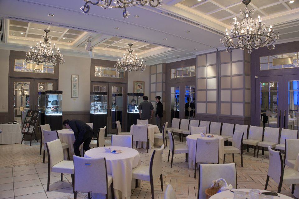 設営の様子、ホテルのパーティールームにて。