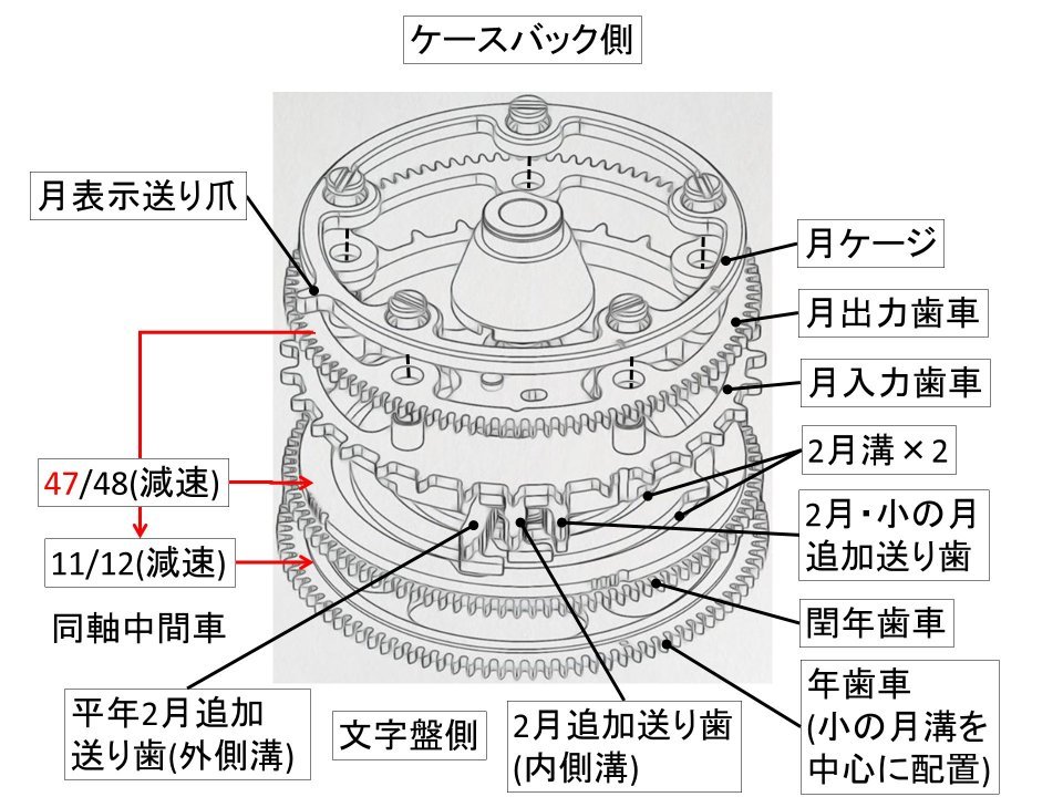 古典永久カレンダーの大敵である年や閏年を計算する歯車の回転が遅いこと(減速比が大きいこと)によるバックラッシ(歯車の遊び)の問題、バックラッシを抑えるために規制バネを入れると抵抗になり月代わりや年代わりの抵抗で止まるという問題、調整が複雑で一方方向にしか合わせられない…という問題を「ほぼ同じ速度(一か月で一周)で回転する月・年・閏年の歯車の「差」で表現する」スマートな解決手法で「この手があったか!」と驚くような仕組みです。