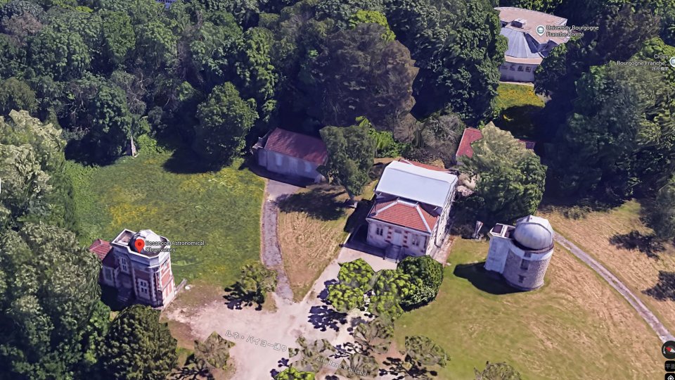 Googleマップから引用、真ん中の建物が子午線儀の施設、左側に見える塔のようなものが校正用の基準マーカーです。