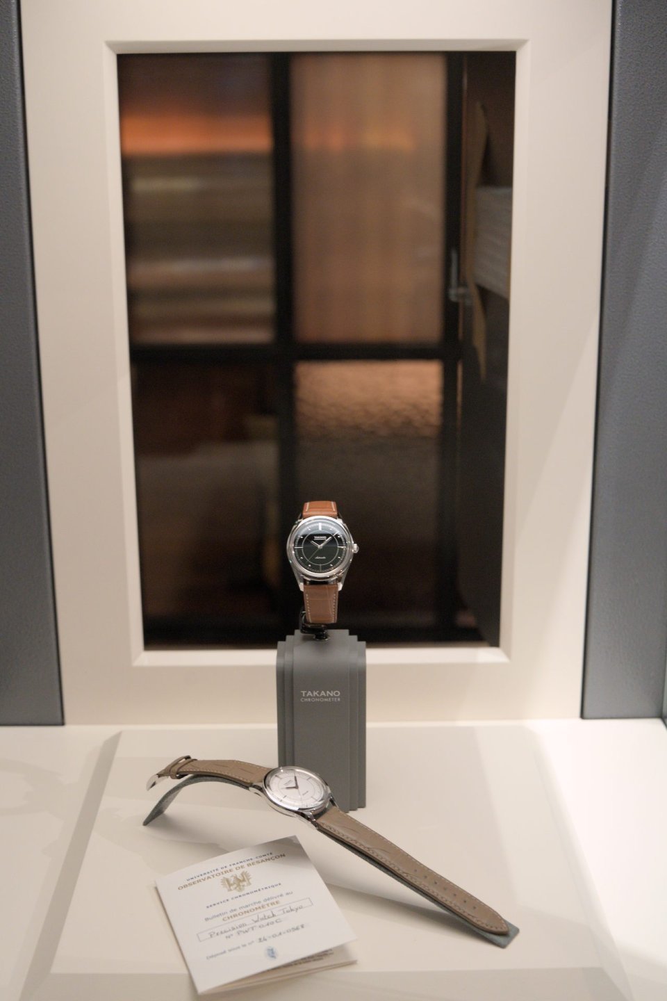 浅岡氏が設計したこだわりの展示ケースに納められたタカノのファーストモデル、シャトーヌーベル・クロノメーター。