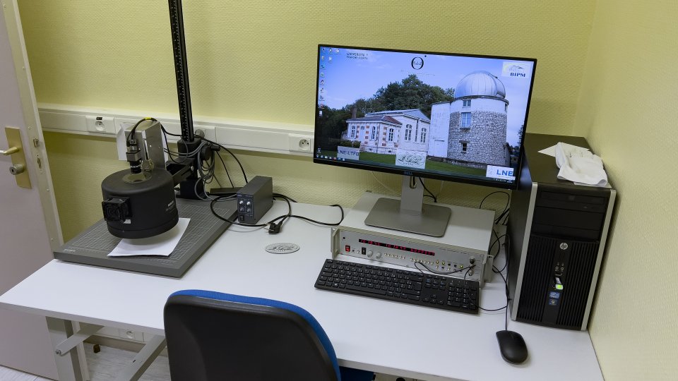 塔の先端に明かり?が灯り、それを望遠鏡で狙う事で温度による金属膨張による誤差を校正します。