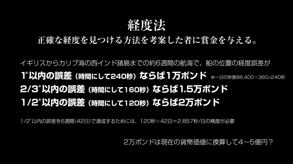 6週間で240秒・160秒・120秒という目標と賞金が定められ、これは当時の機械式時計の基準を大きく上回る性能で、なおかつ不安定な船の上でも安定に動作しないといけない、という困難な条件でした。