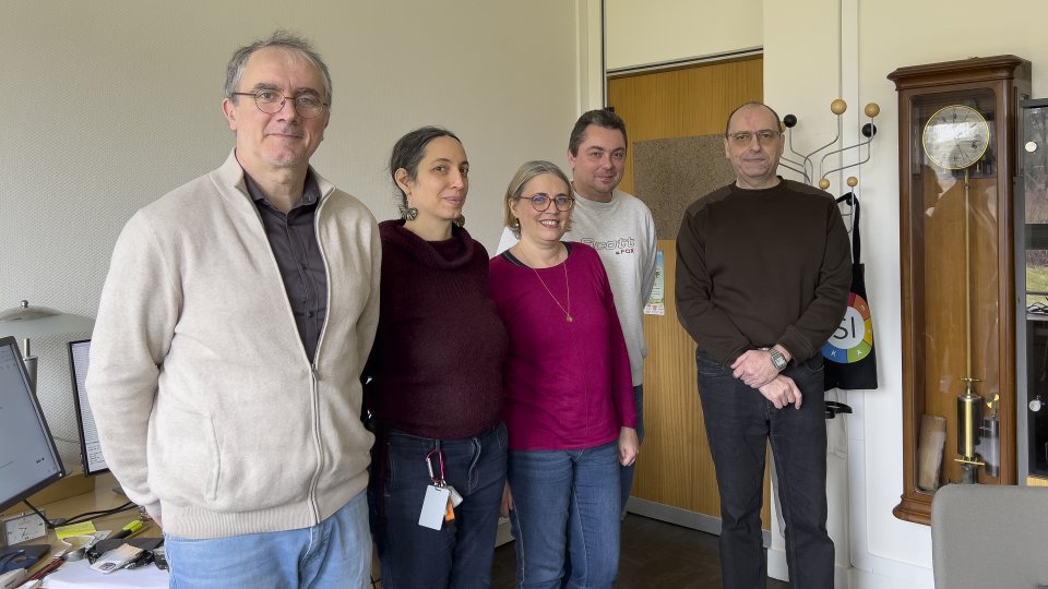 クロノメーター検定を行っているメイヤー氏(一番左)とそのチーム。