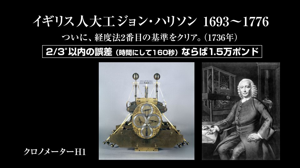 これを実現したのは当時の権威だった「時計師」ではなくアウトサイダーの「大工」であったジョン・ハリソンで、大工の知見を活かした独創的な機構を備えたクロノメーターH1で基準をクリアします。