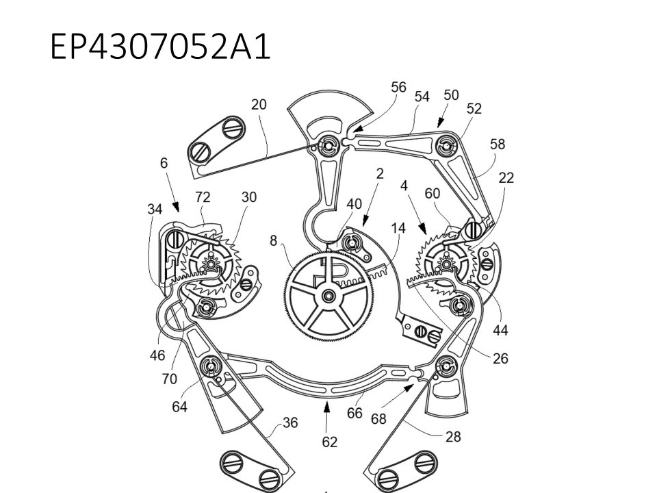 特許番号EP4307052A1(CN119547021A)、特許名CHRONOGRAPH MECHANISM FOR A CLOCKWORK、発明者の一人はジュリオ・パピの特許で、クロノグラフ機構の改善を請求しています。