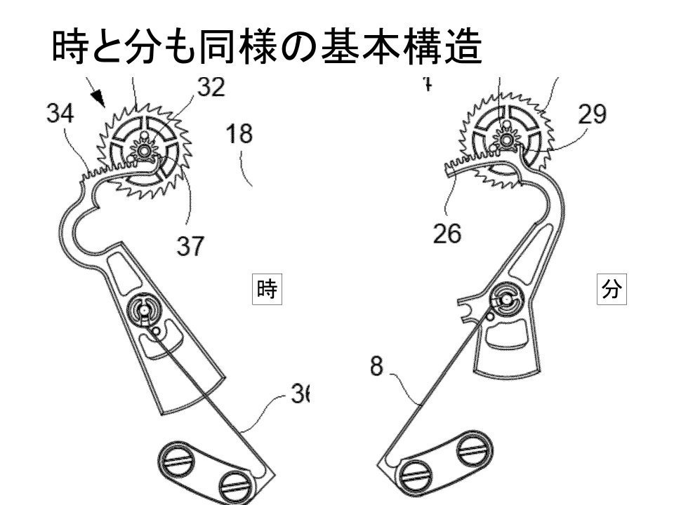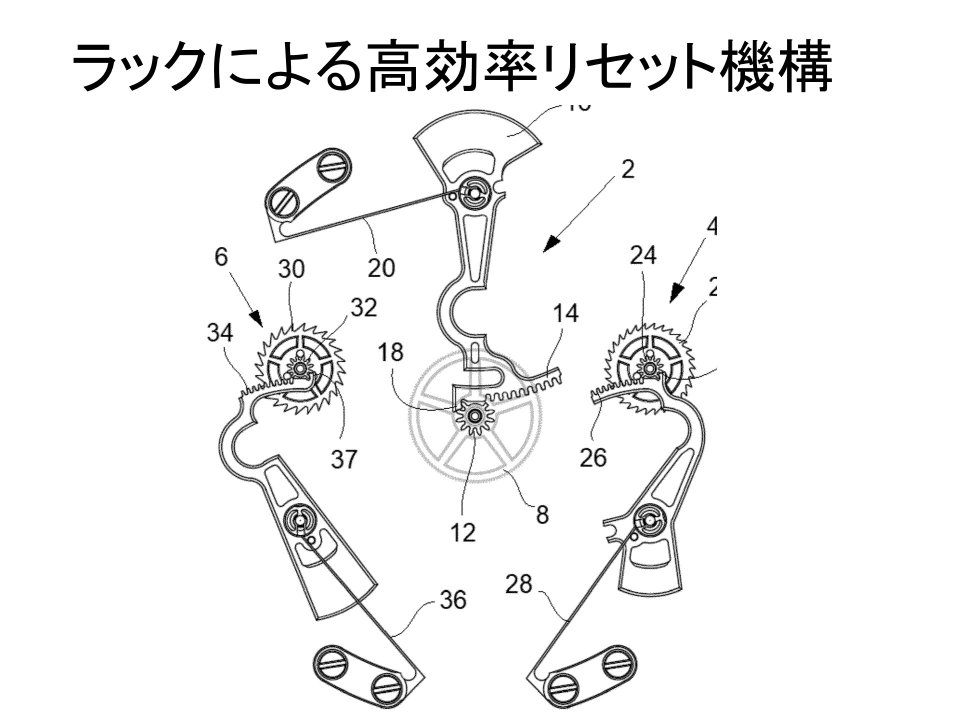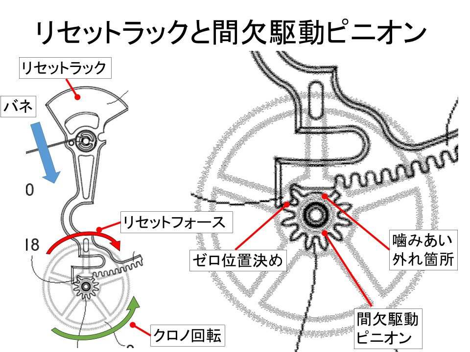 この特許ではクロノグラフ積算計の歯車に取り付けられた要素のハンマーをリセットラック(大きな歯車の一部分を円弧状に切り取った歯車)、ハートカムを一部の歯を省いた間欠駆動ピニオンに置き換えています。