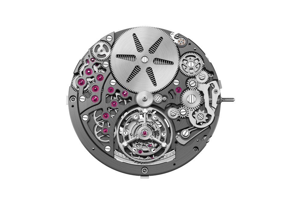 逆に文字盤側はペリフェラルローター的な自動巻き輪列、トゥールビヨンに至るオフセットされた計時輪列、ファンクションセレクターで切り替える巻き上げと時合わせ輪列、と比較的わかりやすいと感じる構成です。