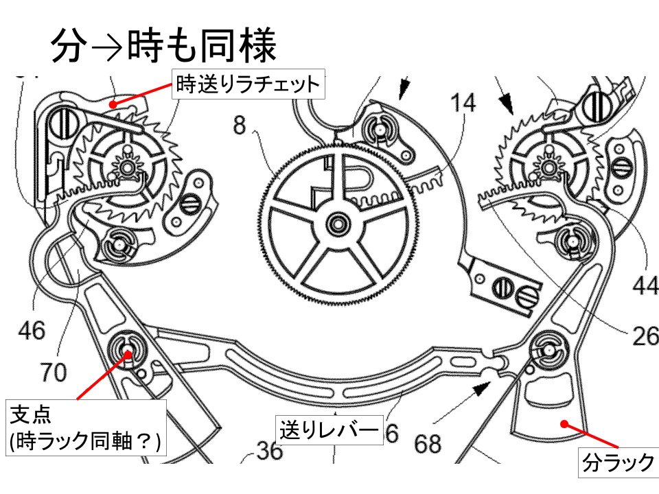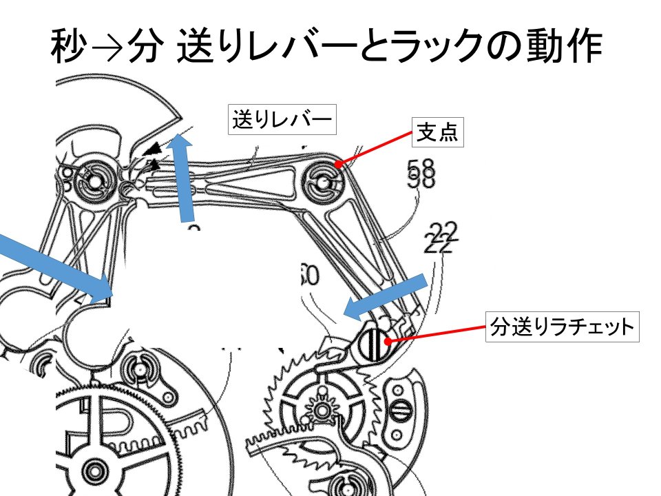 ラックとスプリングにエネルギーを蓄積し、それを一気に放出するエネルギーをレバー経由で分送りラチェットに送り、分積算計を1目盛り瞬時に送ります。