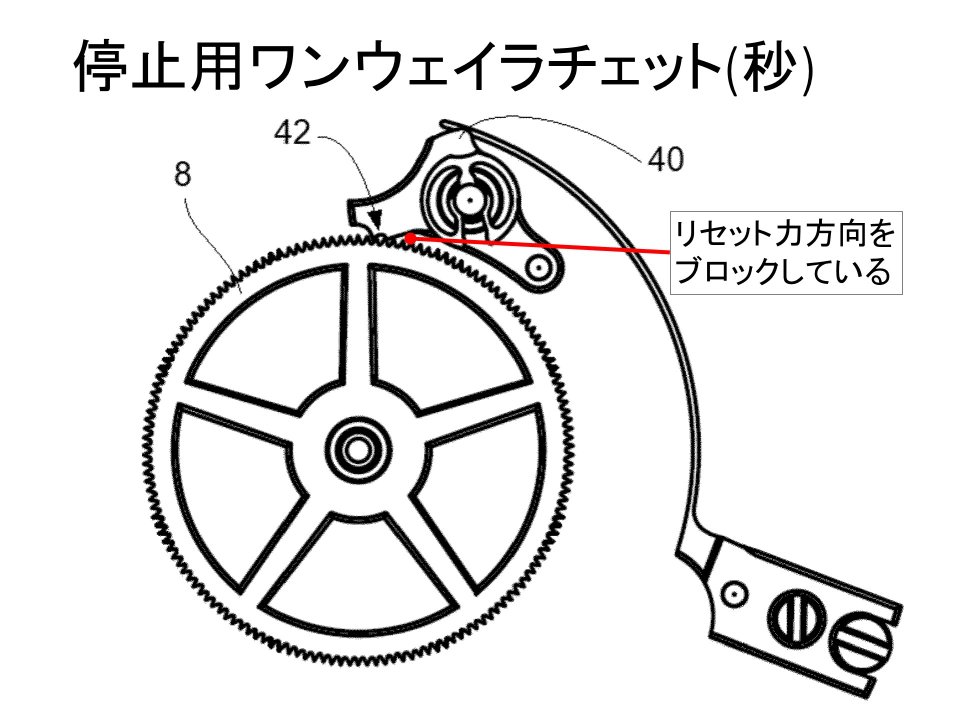 このままではクラッチを遮断すると速攻でリセットがかかってしまうため、リセットフォース方向をブロックするワンウェイラチェットが設けられ、これば通常のクロノグラフのブレーキレバーに相当する役割とリセットタイミングの制御の役割を担います。