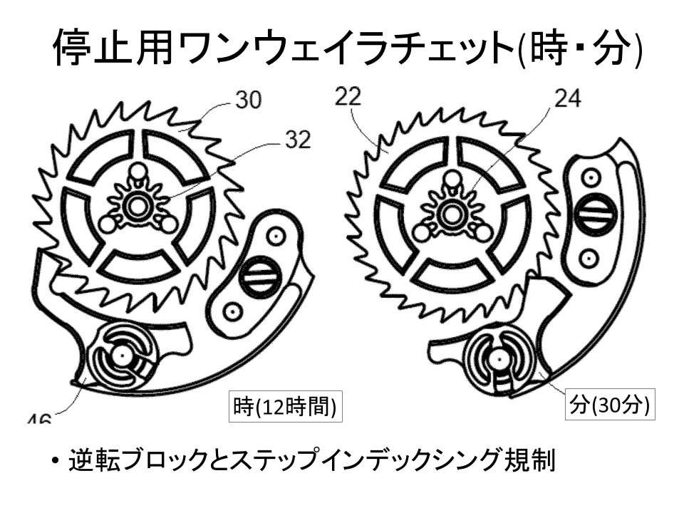 停止用のワンウェイクラッチも同じような構造ですが、連続的な表示だった秒積算計に対し、ジャンピング表示に対応した離散的な位置で停止させるステップインデックシングの規制を行っています。