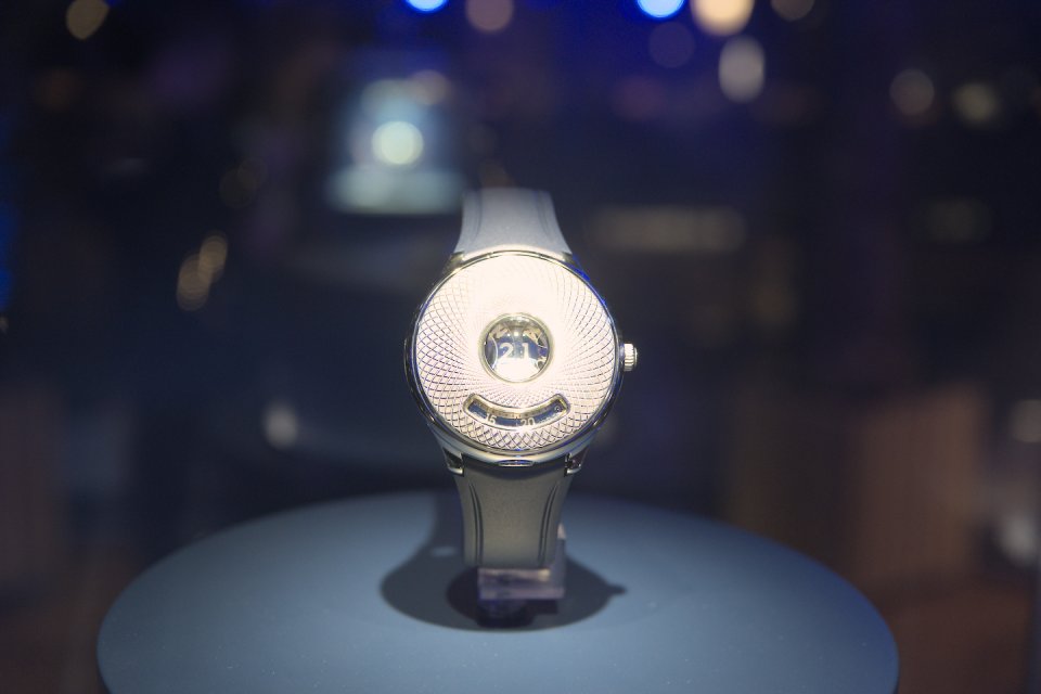懐中時計のハーフハンターケースに着想を得たジャンピングアワーで、ギロッシェが刻まれた蓋を閉じた状態でも開口部からデジタル時刻とディスク分を確認することができ、蓋を開ければ複雑なメカニズムを堪能することができます。