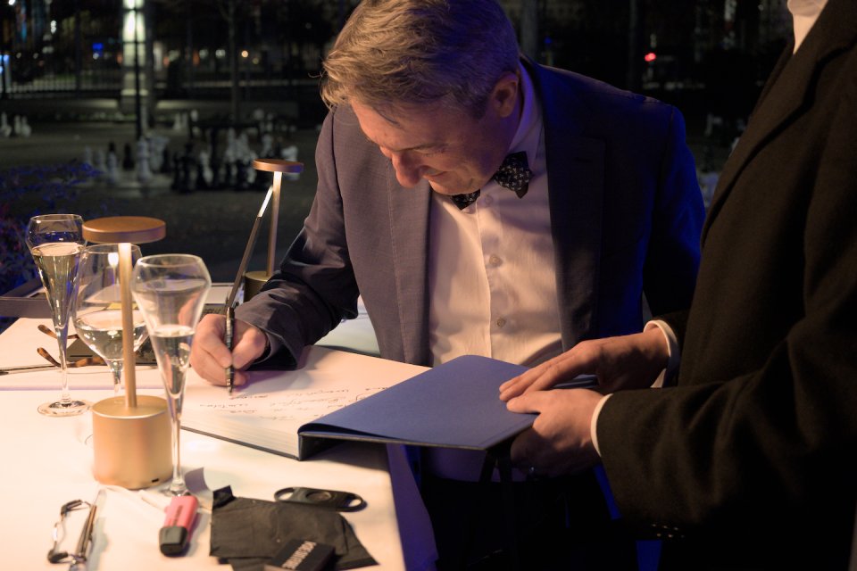 ザビエルは一人ずつあいさつしながらメッセージとサインを入れていくホスピタリティを。