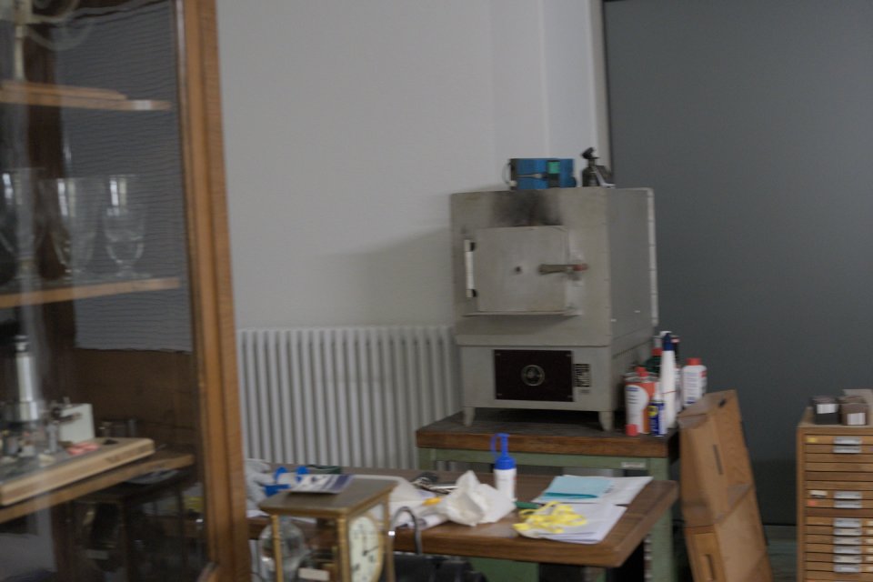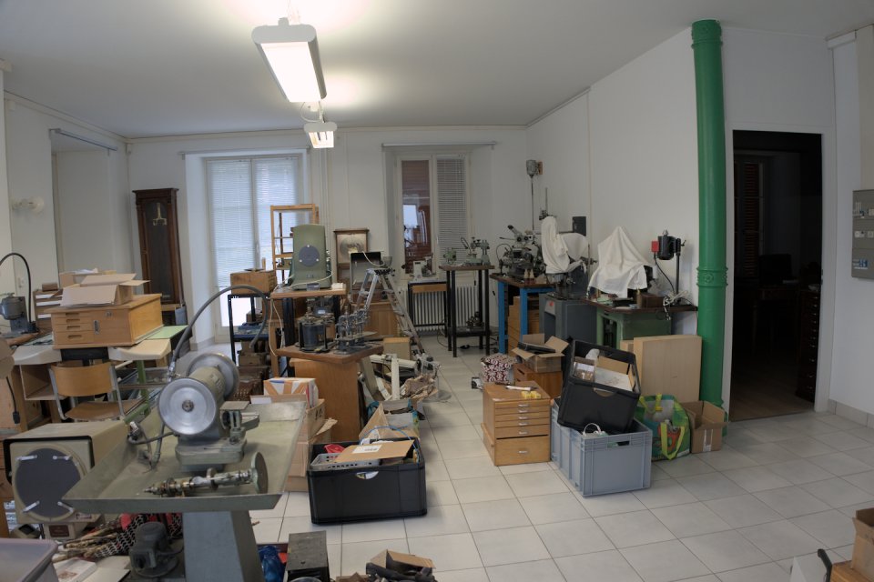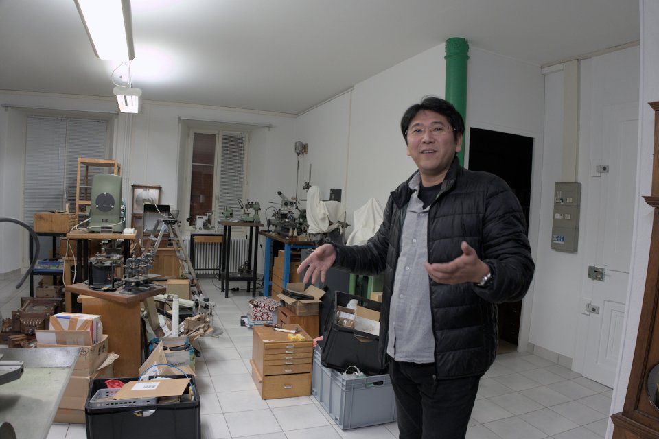 応接スペースから工房を、眺めたショットをとりつつ、ウィッチならカンタロスの脱進が拾える、怪しいやつだとコンスタントフォース脱進で乱されて測れない、という思い出話を…