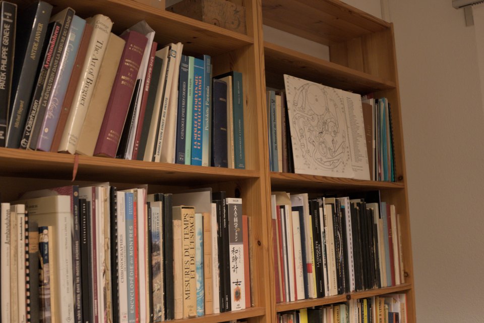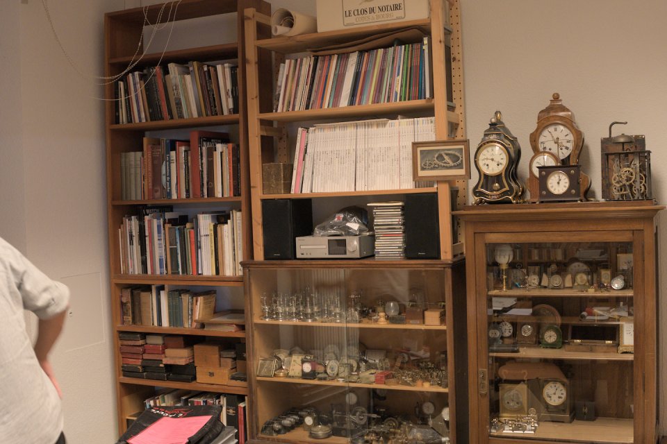 書籍や集めた時計工具、アンティークの置時計が並びます。