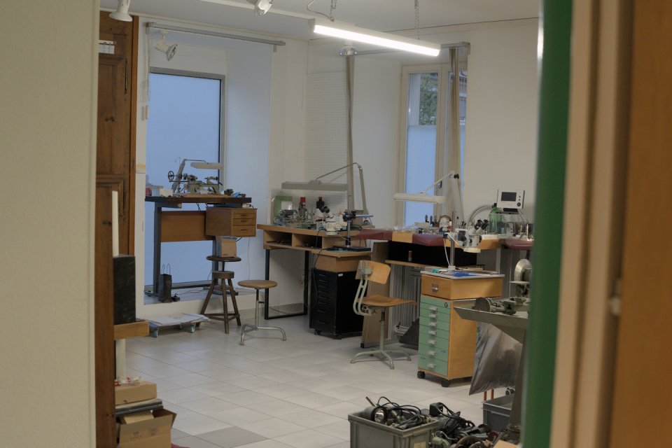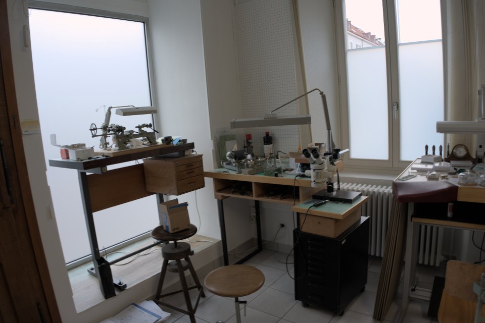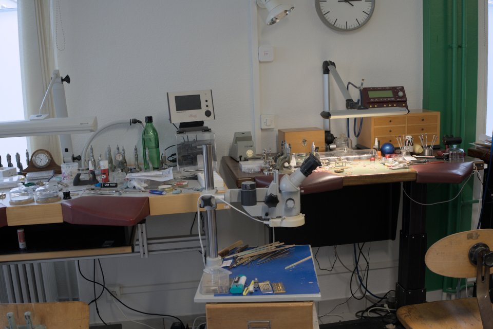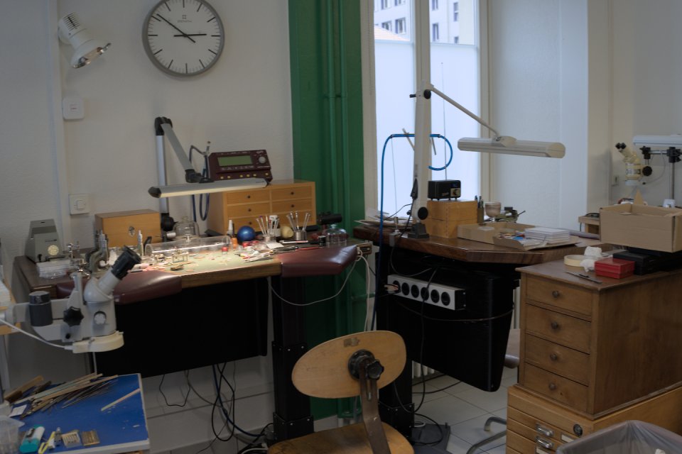 部品の仕上げや組み立てといった各段階の作業に対して使いやすいように調整した専用の時計師机を用意するスタイルで製作が行われています。