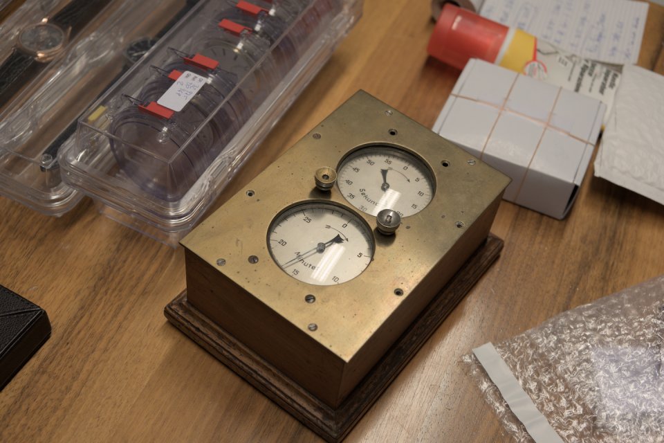 真ん中に映っているのはクロノグラフのご先祖様のような時間計測機器で、上側が秒、下側が分で、まだ清掃しただけで本調子ではないためこれから調整していくそうです。