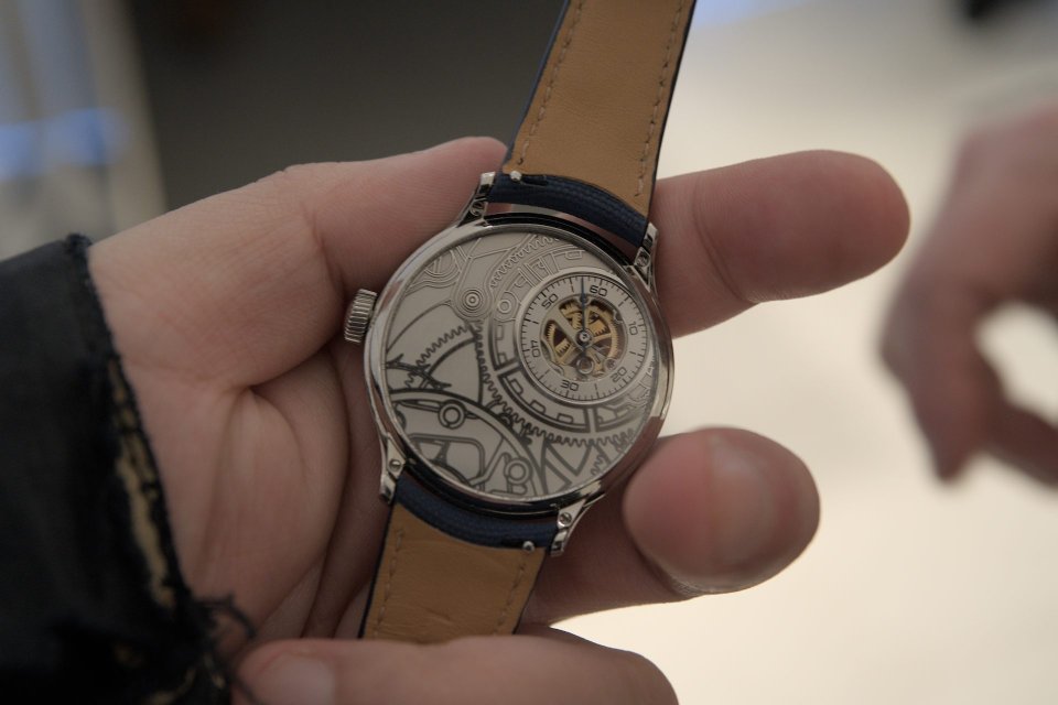 クロノメーター検定に必要な秒針はケースバック側に配置、ルモントワール周辺を意匠化した装飾が施されています。