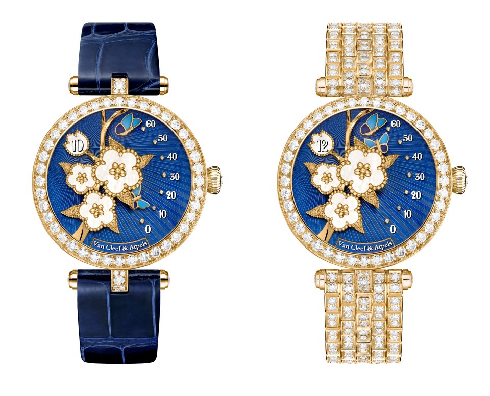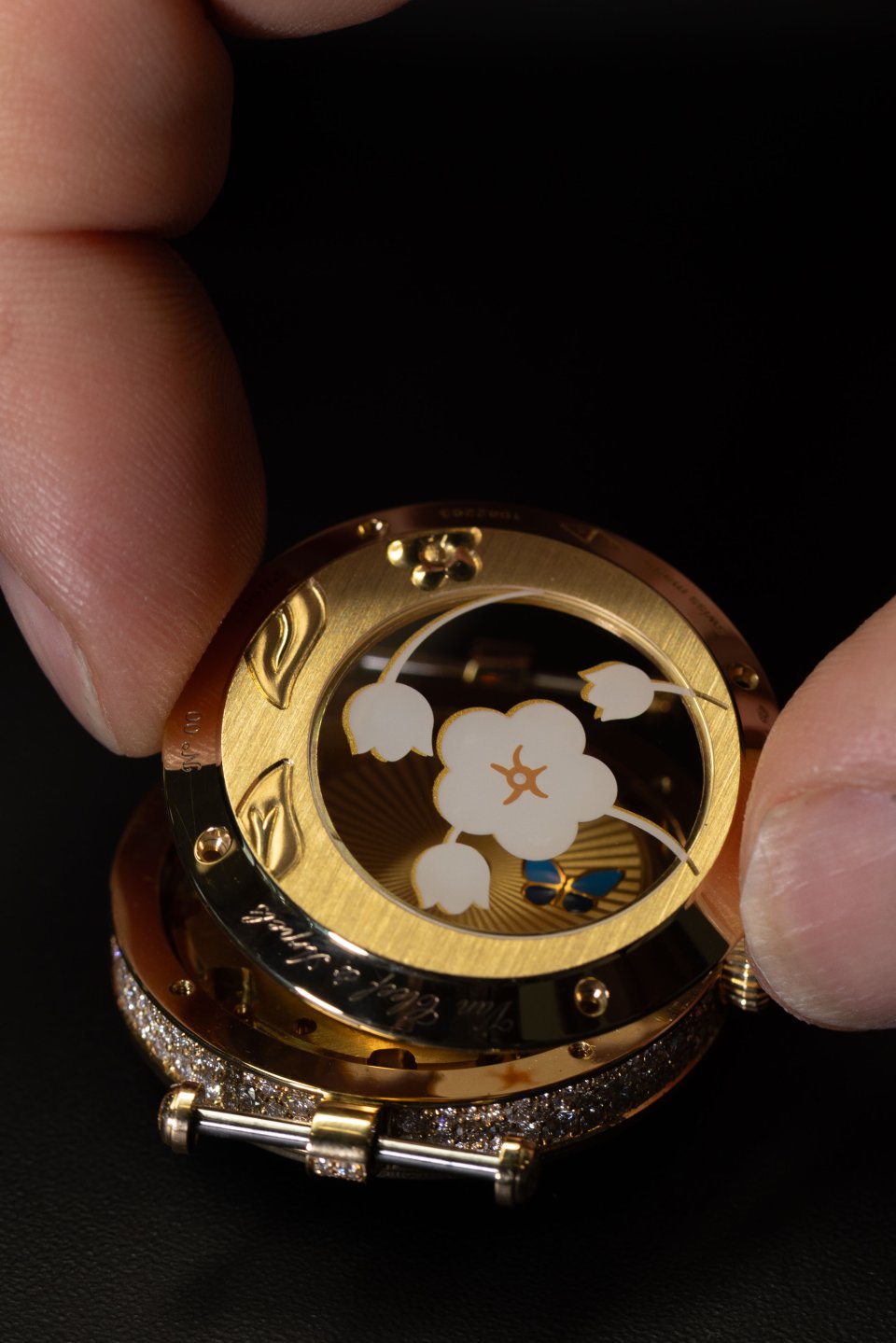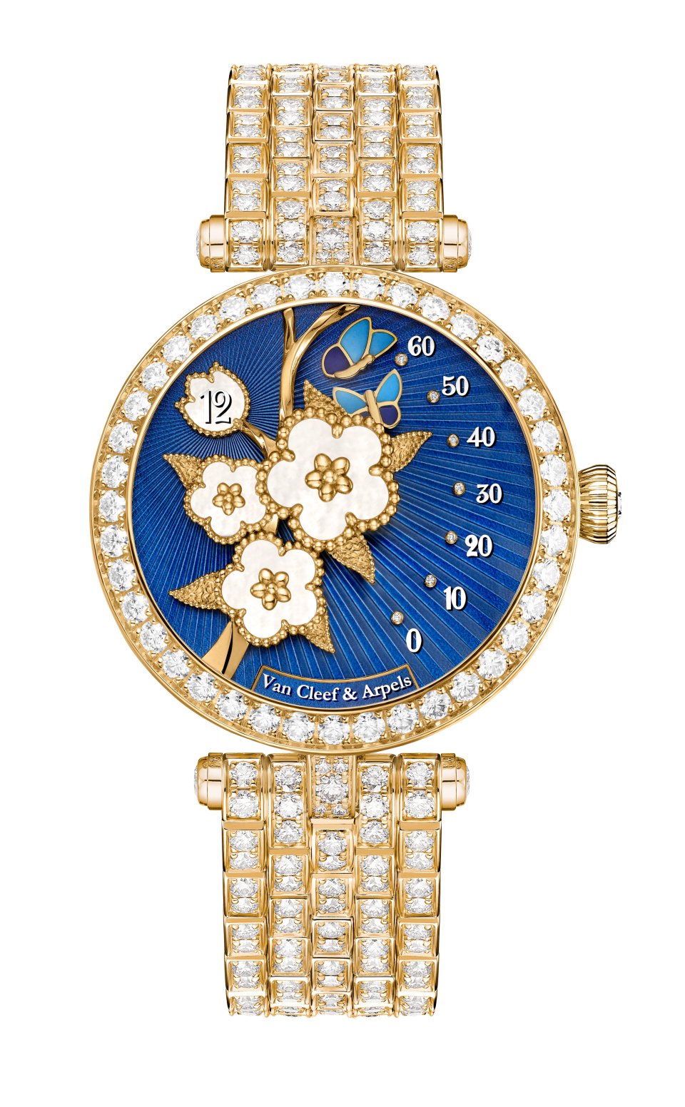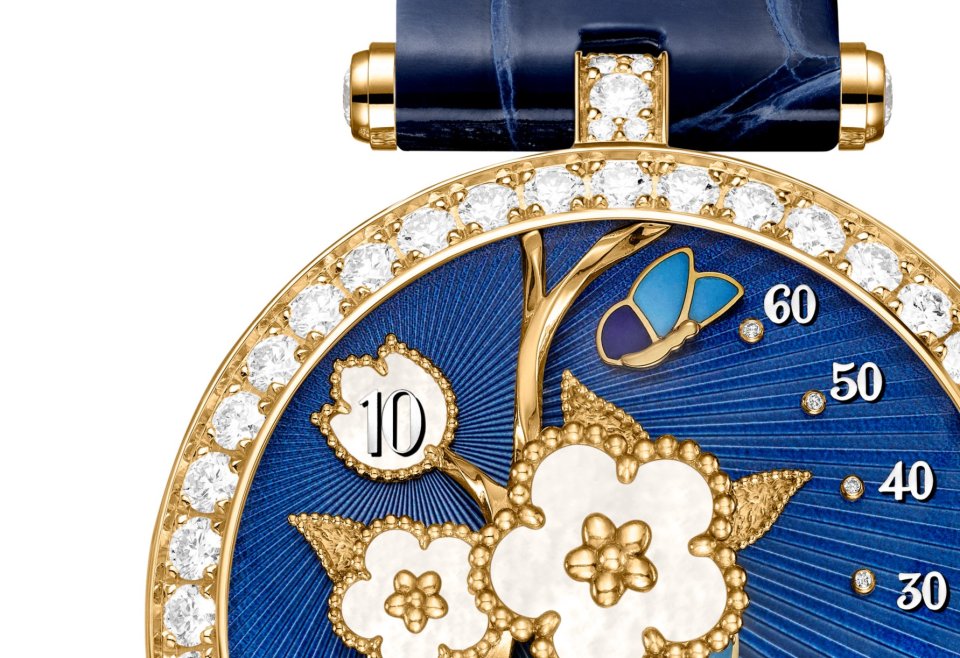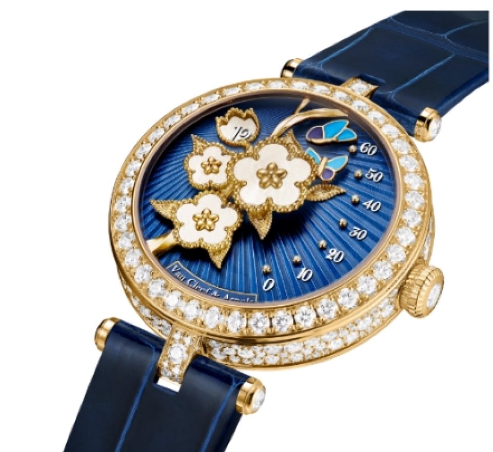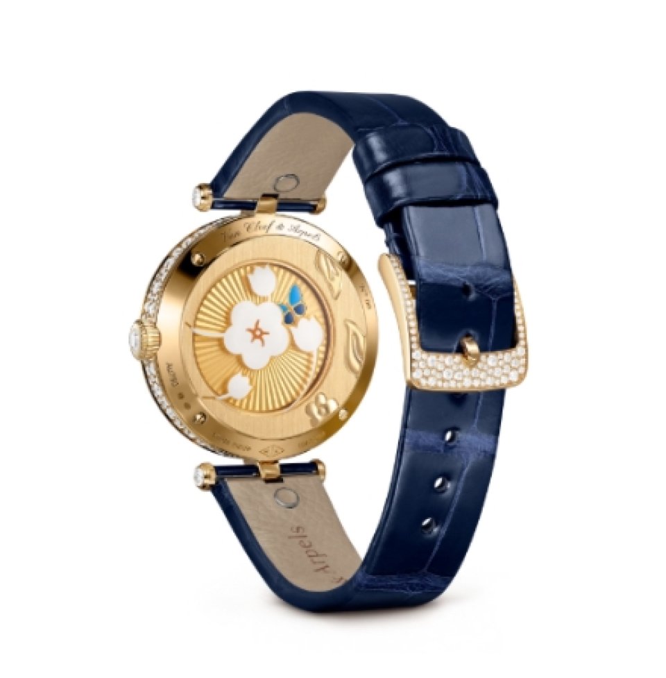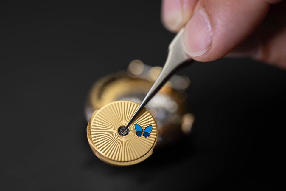 時の流れとともに、羽を広げた蝶は羽を閉じたもう一匹の蝶へと徐々に近づき、新たな時を迎えるたび、羽を広げた蝶は元の位置へと戻り、文字盤上を巡る新たな旅に備える。2匹の蝶はヴァン クリーフ&アーペルが大切にする芸術的な職人技のひとつであるエナメル技法で彩られ、そのブルーのシルエットが鮮やかな色彩のアクセントとなって、情景を引き立てる。