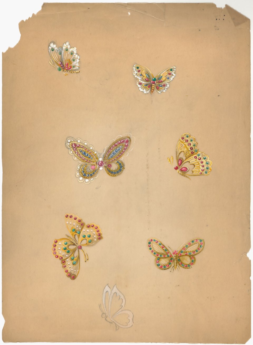 自然の生命力を象徴する蝶は、創業当初から、ヴァン クリーフ&アーペルの世界を鮮やかに彩ってきました。メゾンの販売記録には、パール、ルビー、エメラルドでこのモチーフを表現した1906年の作品が記されています。蝶は、優美さと軽やかさのシンボルとして、しばしば羽を広げた姿で描かれ、今にも飛び立とうとしているかのようです。このモチーフは、長い年月の中で、さまざまな作品を通じて多様な解釈がなされ、プレシャスケースからリング、ネックレス、ウォッチの文字盤までを飾ってきました。とりわけクリップのモチーフとして重用され、メゾンを代表する作品となっています。(画像・上:パピヨン クリップのドローイング)・1945年頃:ヴァン クリーフ&アーペル アーカイブス)