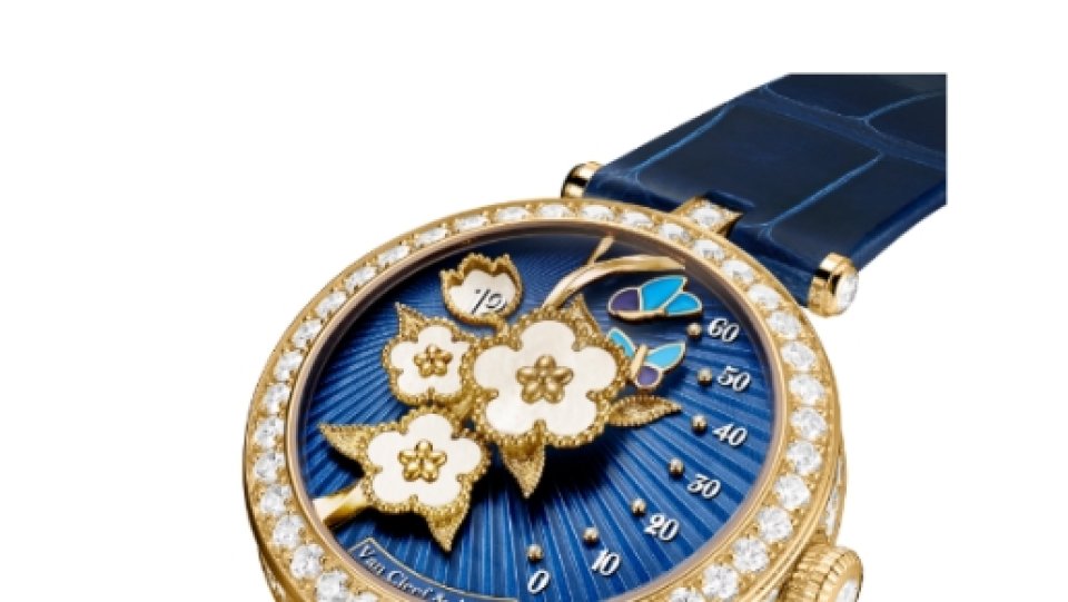 サファイアガラスからは、放射状のギヨシェ彫刻を施してミニアチュール ペインティングで蝶を描いたローターを覗くことができる。このウォッチは、機械式時計の専門知識とメティエダールの証しとして、ジュネーブにあるヴァン クリーフ&アーペルの時計制作のアトリエですべて組み立てられています。