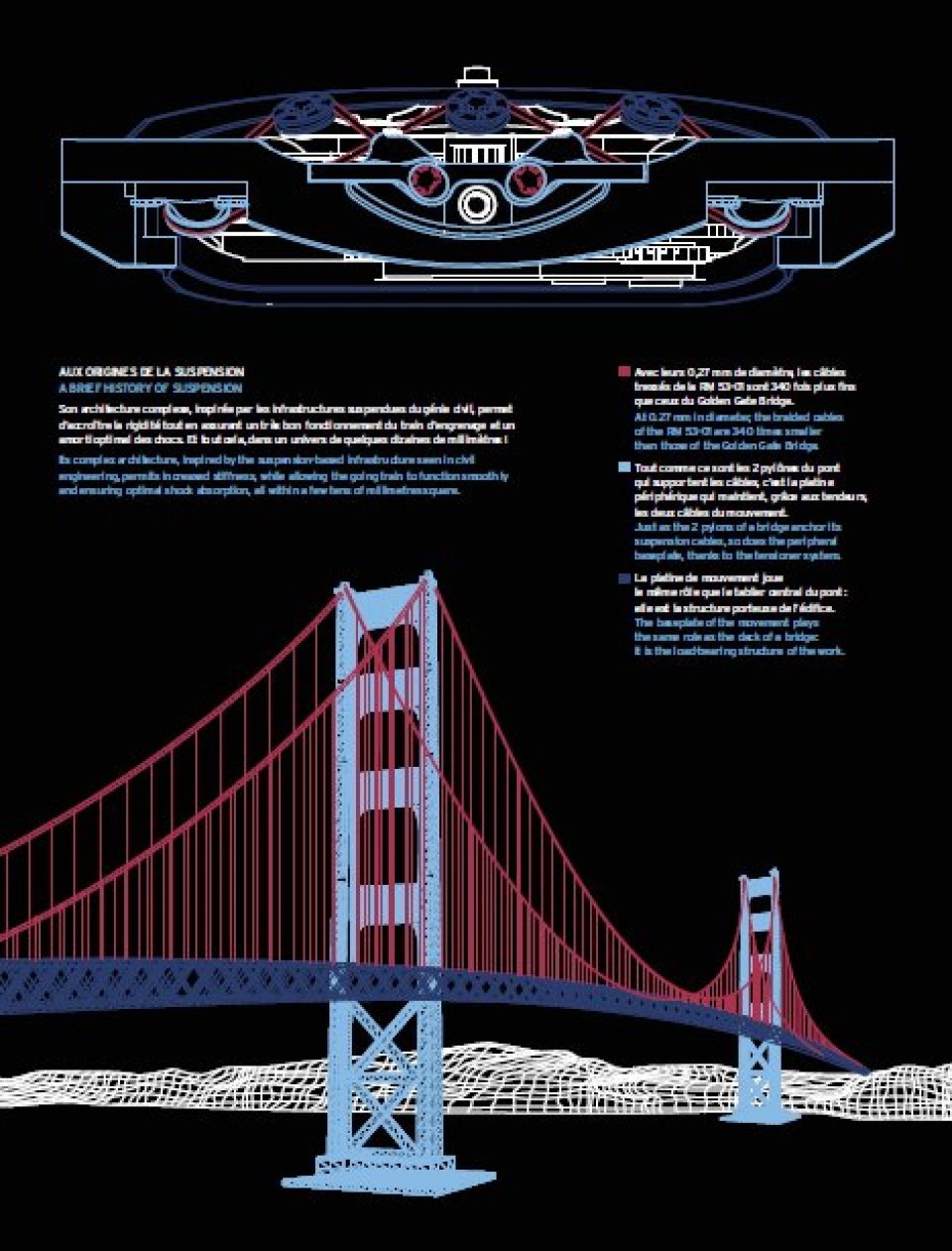 そして今回、耐衝撃という面でこの2つの先例から進化を遂げたRM 53-01のケーブルは、RM 27-01開発時に発想された吊り橋の構造原理に立ち返り、建設分野での発明を、直径0.27mmのケーブル2本で地板を吊るすサスペンション機構に変換、時計製作に新たな新境地をもたらしたのである。