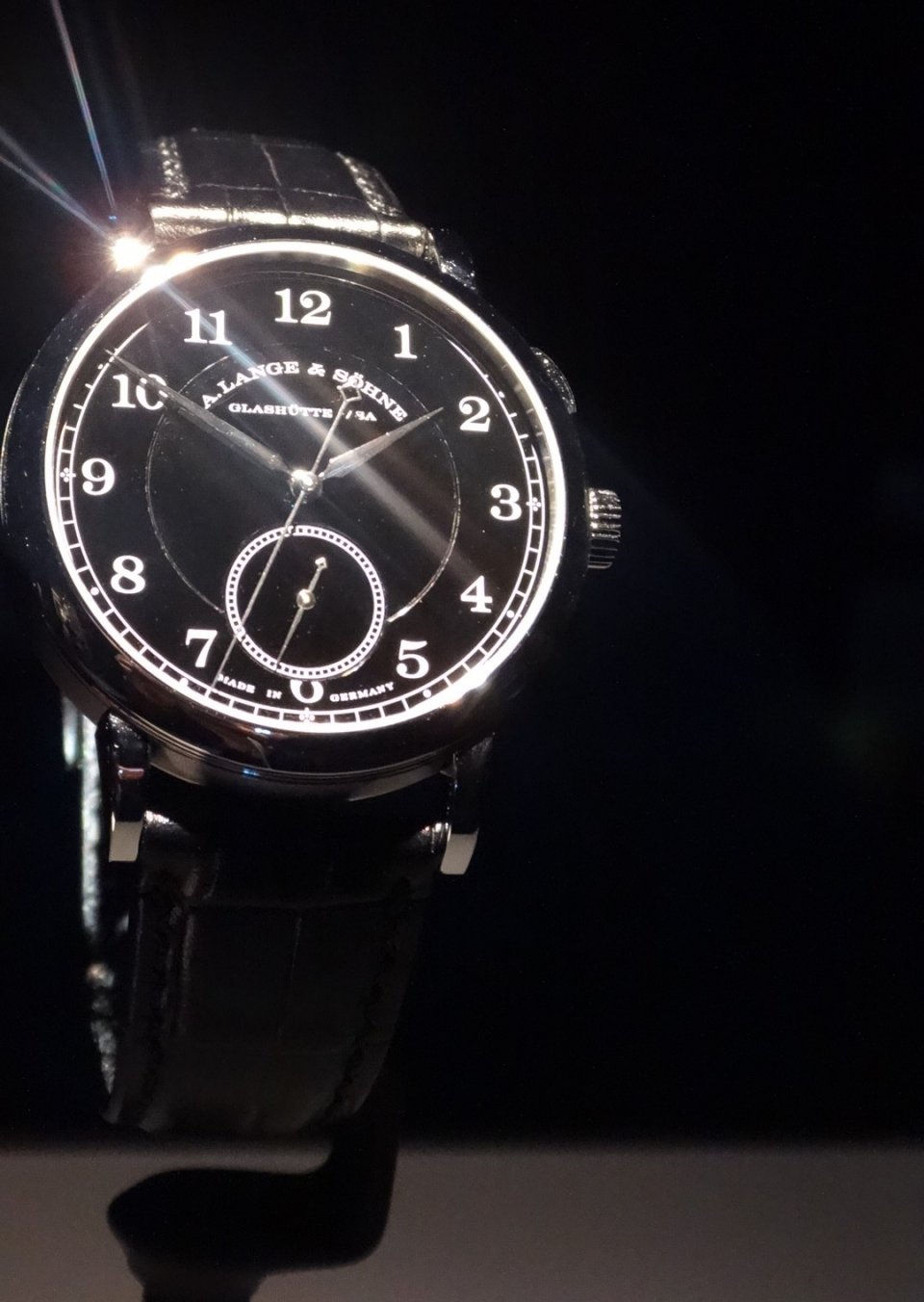 SIHH期間中、この時計はA.ランゲ&ゾーネ・ブースの奥の部屋に設置されたガラスケース内に展示されており、触れることは叶わなかったので、重量感やフィット感は全然わからなかったし、おそらく、オークションの終了後は目にすることすら叶わなくなると思われるので、ガラス越しであまり写りは良くないのだが、しばし実機写真を。