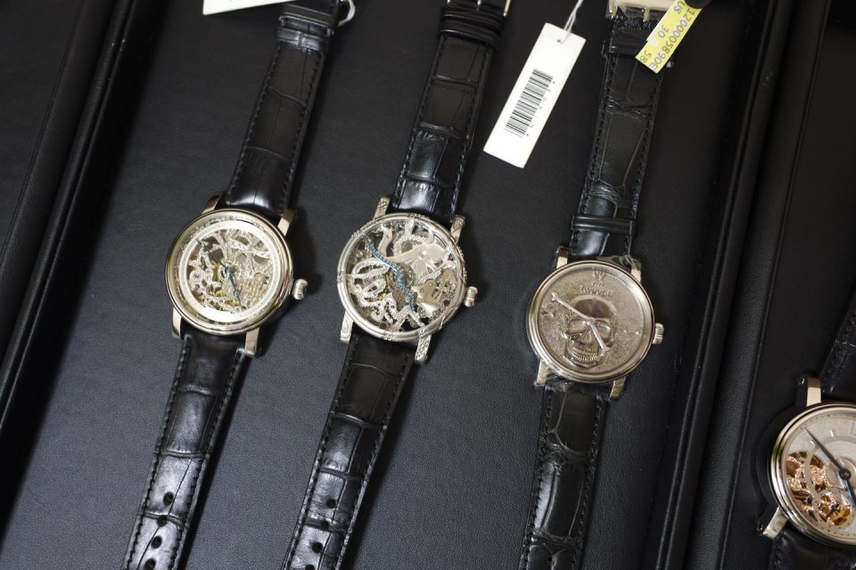 右のスカルはハンマリング加工による文字盤、時分針も骨です。