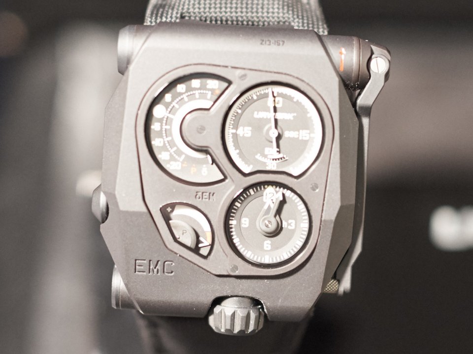 中心が時分(針表示)、右上が秒(ディスク表示)、左下がパワーリザーブ(針表示)、そして左上の赤いリングがEMCを象徴する内蔵歩度測定器のディスプレイです。