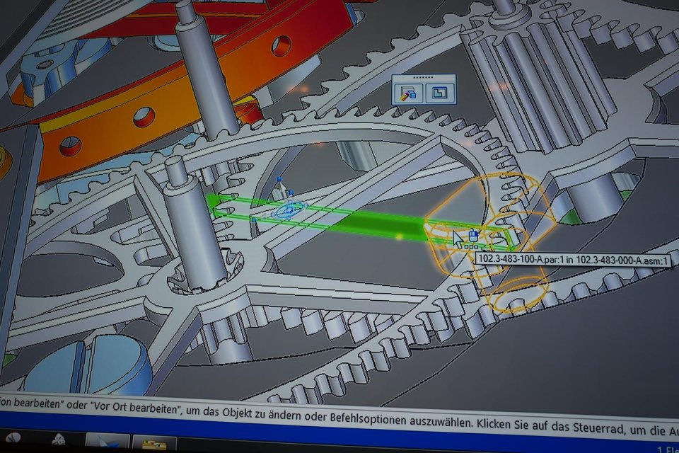 102.3では重ならないようにするために4番車をずらし、その代わりにスモールセコンドは3番車に噛み合った別のピニオンで動かすインダイレクト(間接)スモールセコンドとすることで、重なりを減らし、厚みを押さえています。