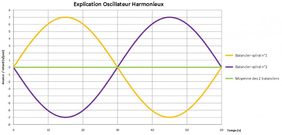 180度反転した配置によって、重力が逆方向にかかるので日差は逆方向に発生し、黄色(Balancier-spiral no1)と紫(Balancier-spiral no2)の線で表される軌跡を描きます、その平均(Moyenee des 2 balanciers)を取ると、ちょうど打ち消しあって常に0になります。