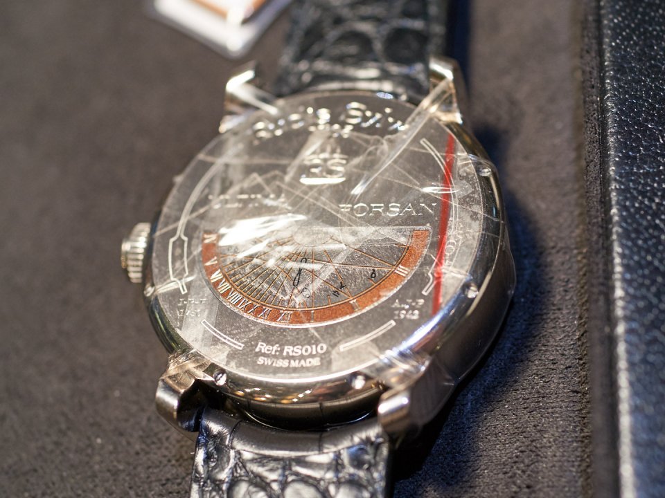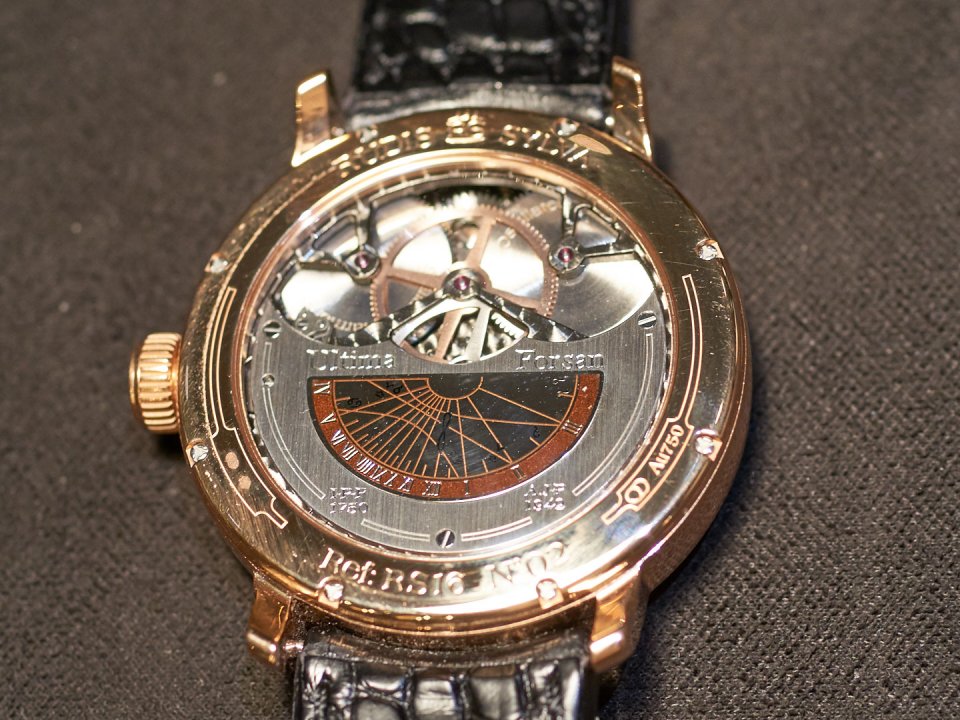 見ての通り、ソリッドバックでRS16ではムーブメントに描かれていた日時計の模様がケースにエナメルで描かれています。