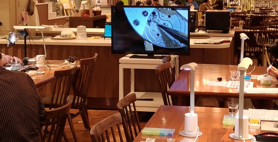 今回は学校法人 ヒコみづのジュエリーカレッジ時計コースご協力のもと行われた講座で、バラバラになった時計を講師がモニターで解説しながら組み立ててく方式でした。