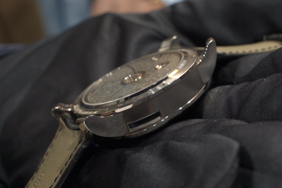 グルーベル フォルセイを特徴づける非対称ケースと脱進機を観察するための開口部が見えます。