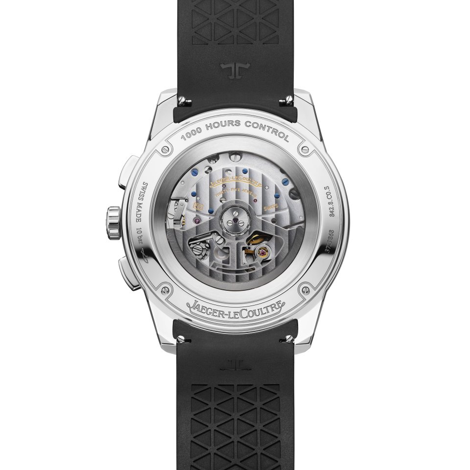 サファイアクリスタルのケースバックからは、自動巻きムーブメント、キャリバー761を眺めることができます。これは、高性能と機械としてのエレガンスを組み合わせたジャガー・ルクルトの時計製造へのアプローチの真髄です。二重香箱を備えたこの完全一体型クロノグラフ ムーブメントは、 垂直クラッチを採用したコラムホイール クロノグラフ機構を搭載し、65時間のパワーリザーブを 提供します。