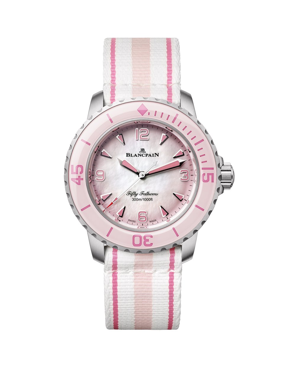 スポーティなストラップは、ピンクのツートーンストライプをあしらったホワイトの布製ストラップを備えたピンクモデルと、ブラックのトロピックラバー、ブラックのセイルキャンバス、またはブラックのNATOストラップを備えたブラックモデルからお選びいただけます。 100時間のパワーリザーブとシリコン製ヒゲゼンマイを備えたブランパンの キャリバー1153を搭載しています。