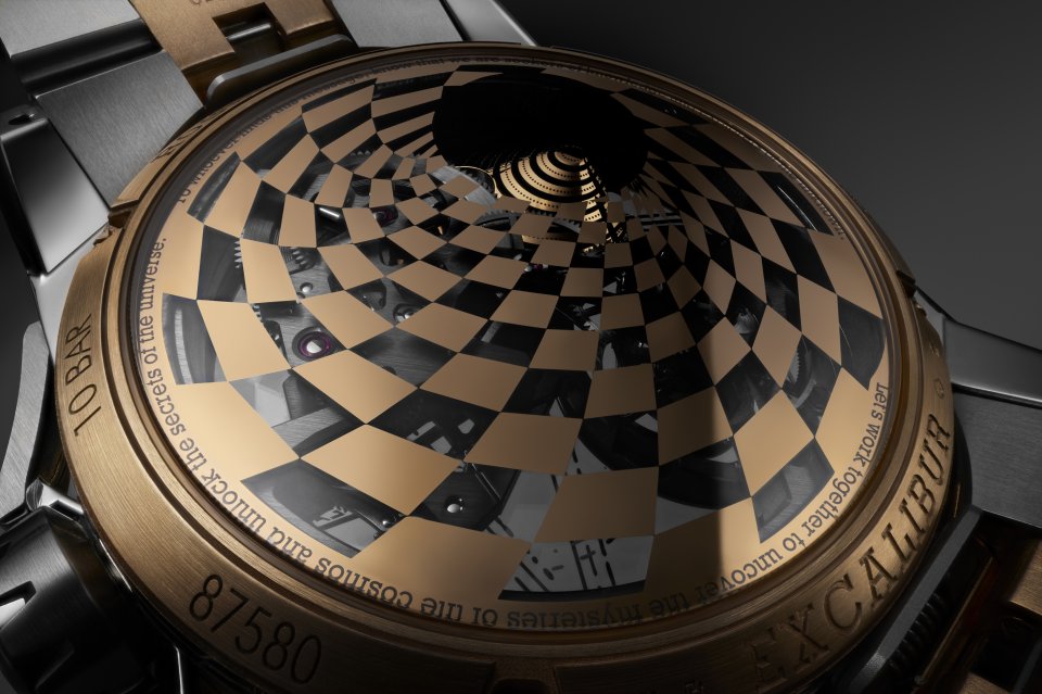 時計を裏返すと、“ブラックホール”をご覧いただけます。ケースバックから眺めると、ブラックカラーリングのほか、一部にメタライズ加工を施したサファイアクリスタル上に渦巻のようなチェッカーボードパターンが姿を現します。果てしなく続く宇宙の無限さと時の歪みを新たに表現しています。