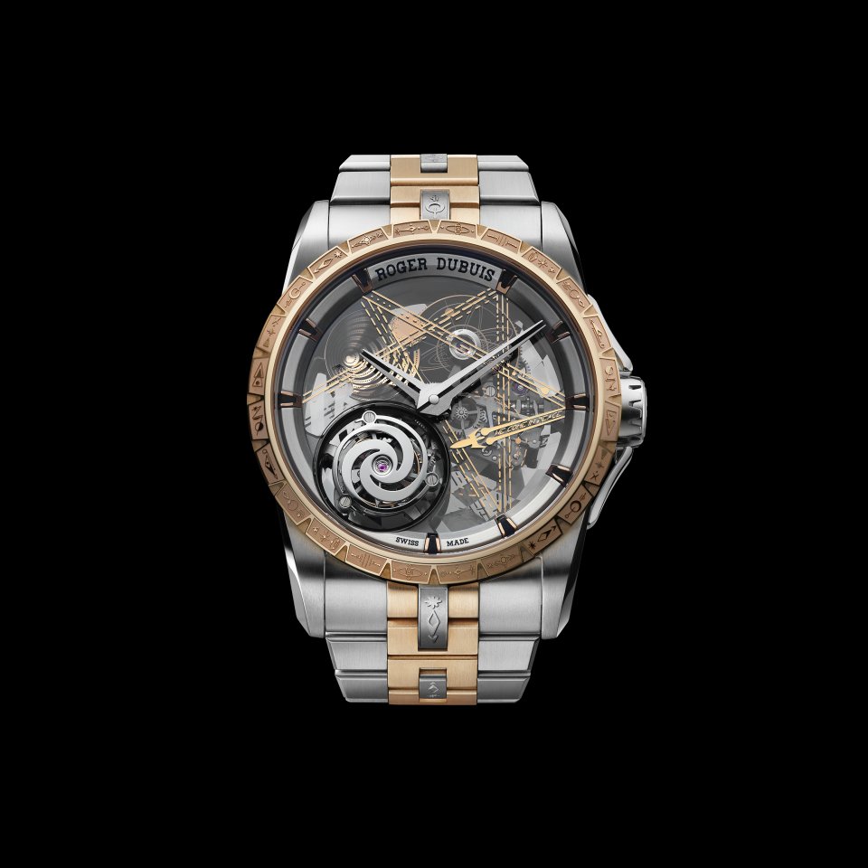 このエクスカリバータイムピースにインスピレーション溢れるすべてのディテールを収めるため、ロジェ・デュブイは18Kピンクゴールドとチタンという珍しい組み合わせを採用。これらの素材を42mmのケースとクイックリリースシステムを備えたブレスレットに取り入れることで、優美さ、耐久性、軽さを実現しました。