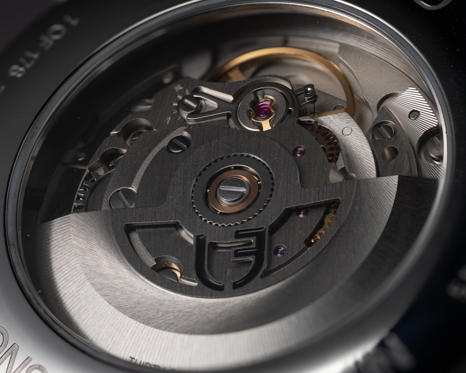 12 時位置には単眼の時表示ディスク、6 時位置には鋭い歯を持つ回転式のスモールセコンド、そして中央には型破りな分針を備えています。