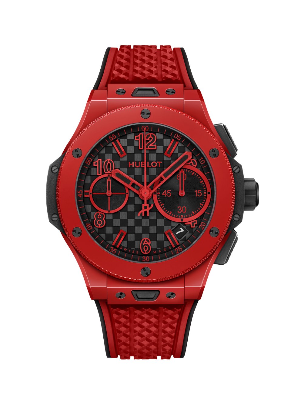 43mm のレッドセラミックケース、レッドセラミックベゼル、レッドラバーストラップ。
