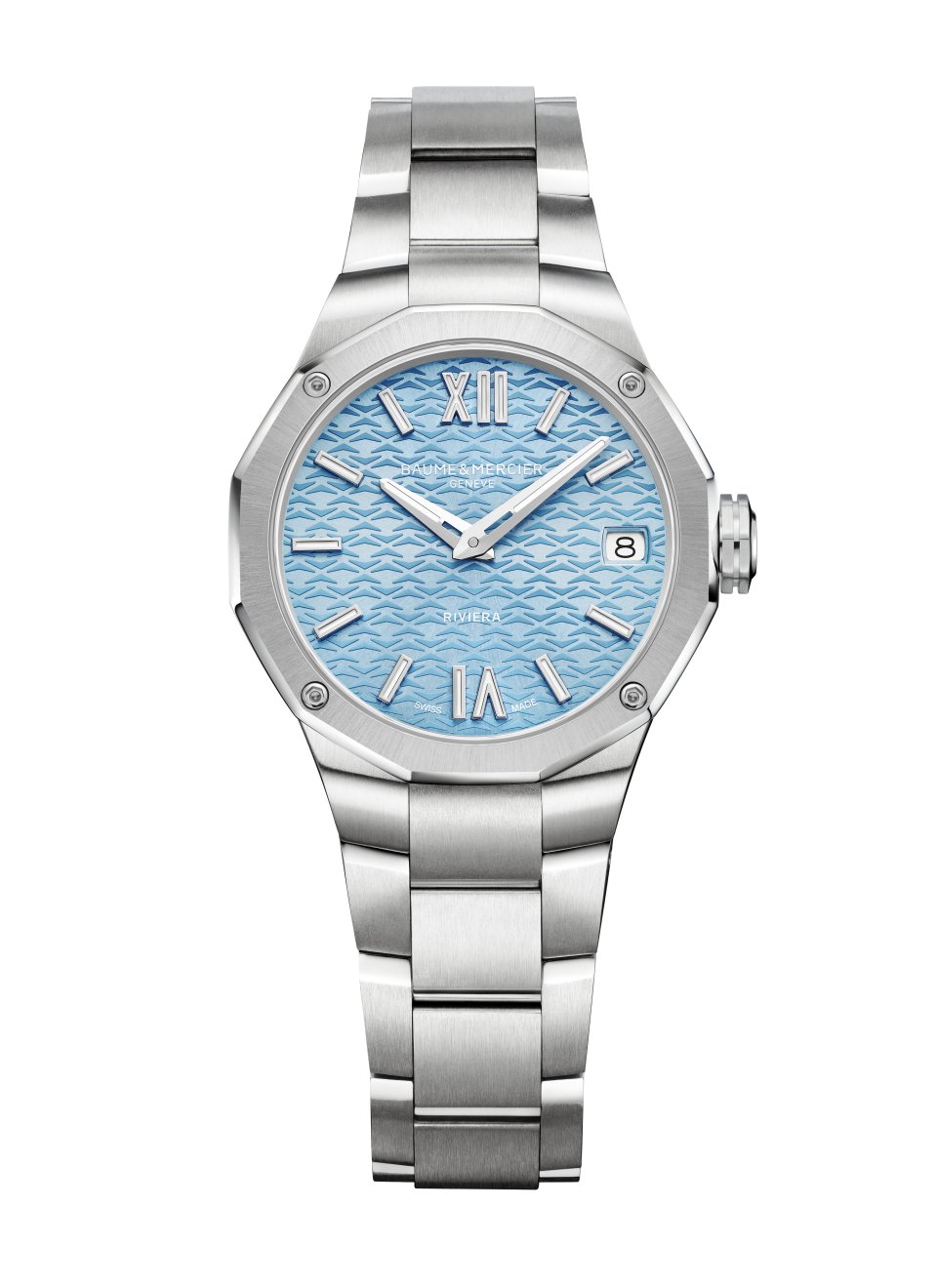この夏、リビエラ コレクションの注目の新モデルは、海をイメージした印象的なブルーのタイムピースです。透明プリントの波のモチーフは、思わず飛び込みたくなるように魅力的です。ローマ数字、リベット留めインデックス、ファセット付の針(時・分)は全てロジウム加工で白のスーパールミノバ(ブルー発光)を塗布しています。3時位置の窓にはデイトを表示。