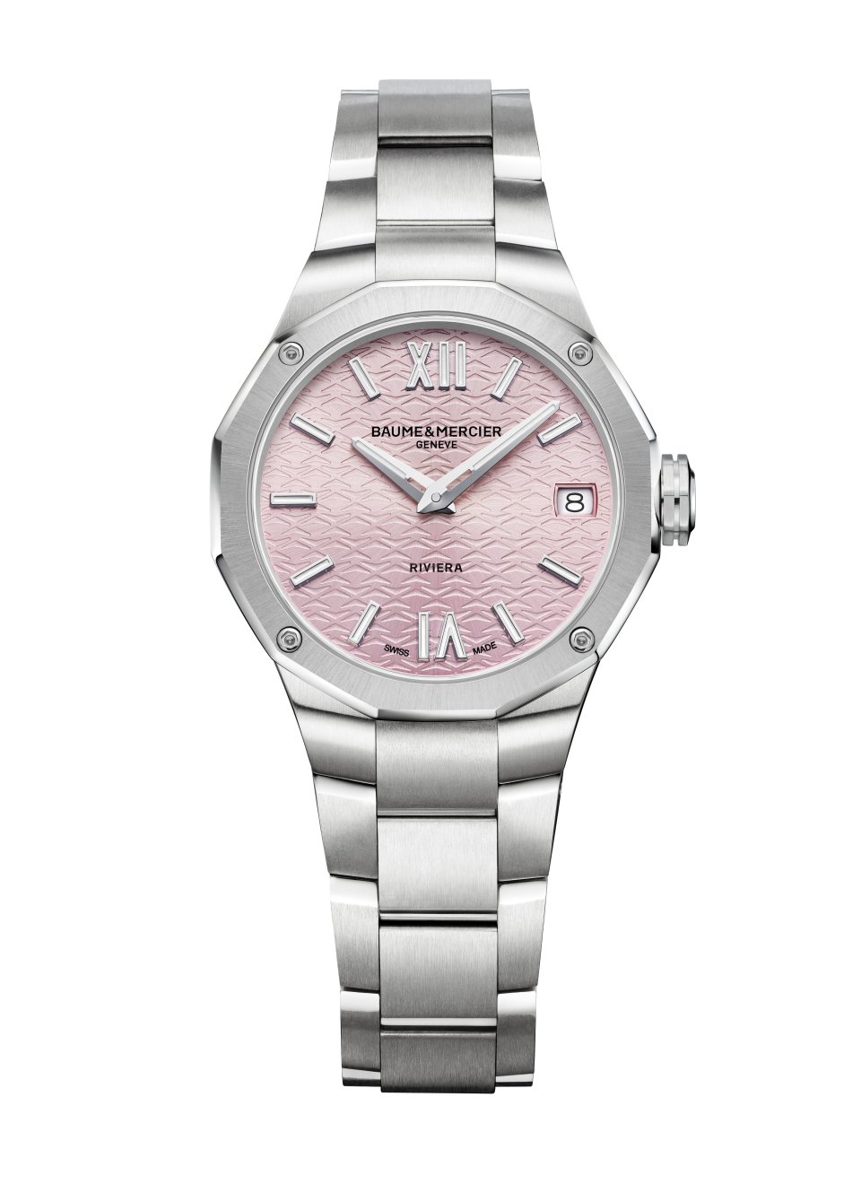 ウォームシルバーカラー(Riviera M0A10810)、クリアブルー(M0A10811)、ローズピンク(M0A10812)の3種類のパステルカラーダイヤルが3つの新作レディスモデルを飾ります。ホワイトダイヤル(リビエラ M0A10829)は2021年のリビエラ再登場以来のカムバックで、コレクションの人気モデルのブルー、ブラック、グリーンのラインに加わります。