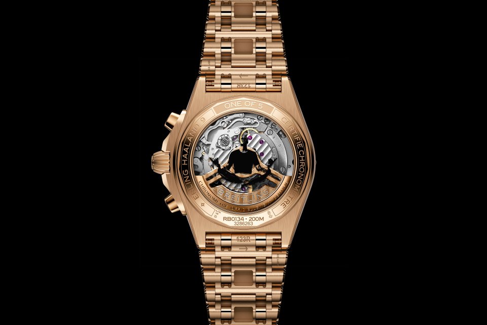 コレクションの締めくくりは、ハーランドと彼の同志のために作られた超希少な「ONE OF 5」エディションです。18Kレッドゴールド製のこのモデルは、メテオライト文字盤を採用し、ブライトリング マニュファクチュール キャリバー 01ムーブメントを眺めるサファイアクリスタル製ケースバック、特注エングレービングで彼の名前と背番号が施されたケースサイドが特徴です。ケースバックには、ゴールセレブレーション「ロータスポーズ」をとったハーランドの姿も描かれています。このモデルは、彼の彗星のごとき躍進に敬意を表すごく私的なものとして製作され、一般販売は行われません。