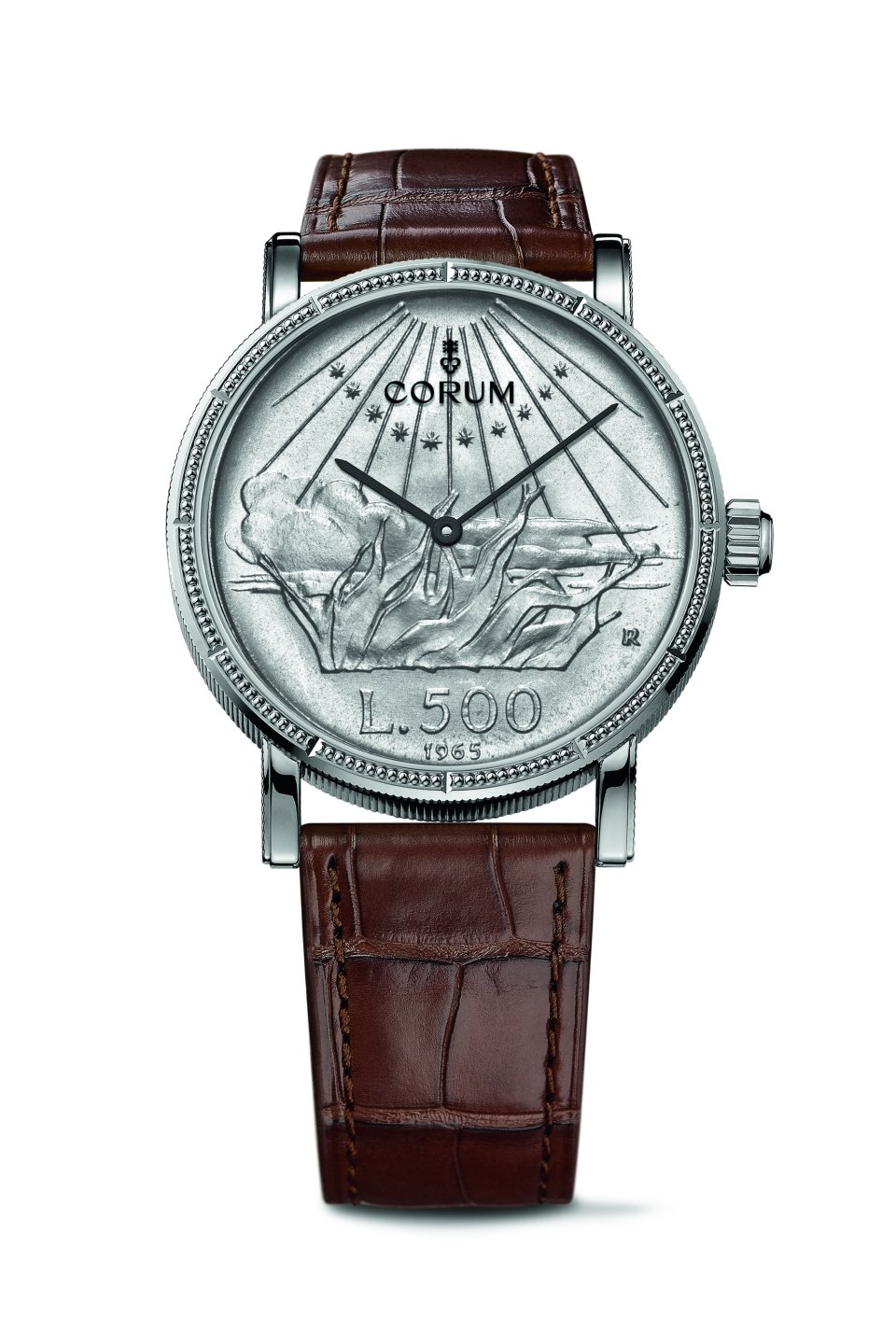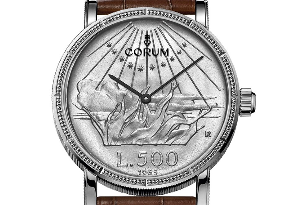 イタリア・500リラ銀貨を薄くスライスし、自動巻き2針ムーブメント( Cal. CO 082)を挟み込むようにケーシング。銀貨のデザインを損なわないよう、秒針やインデックスのないミニマルなダイアル表示を採用しています。