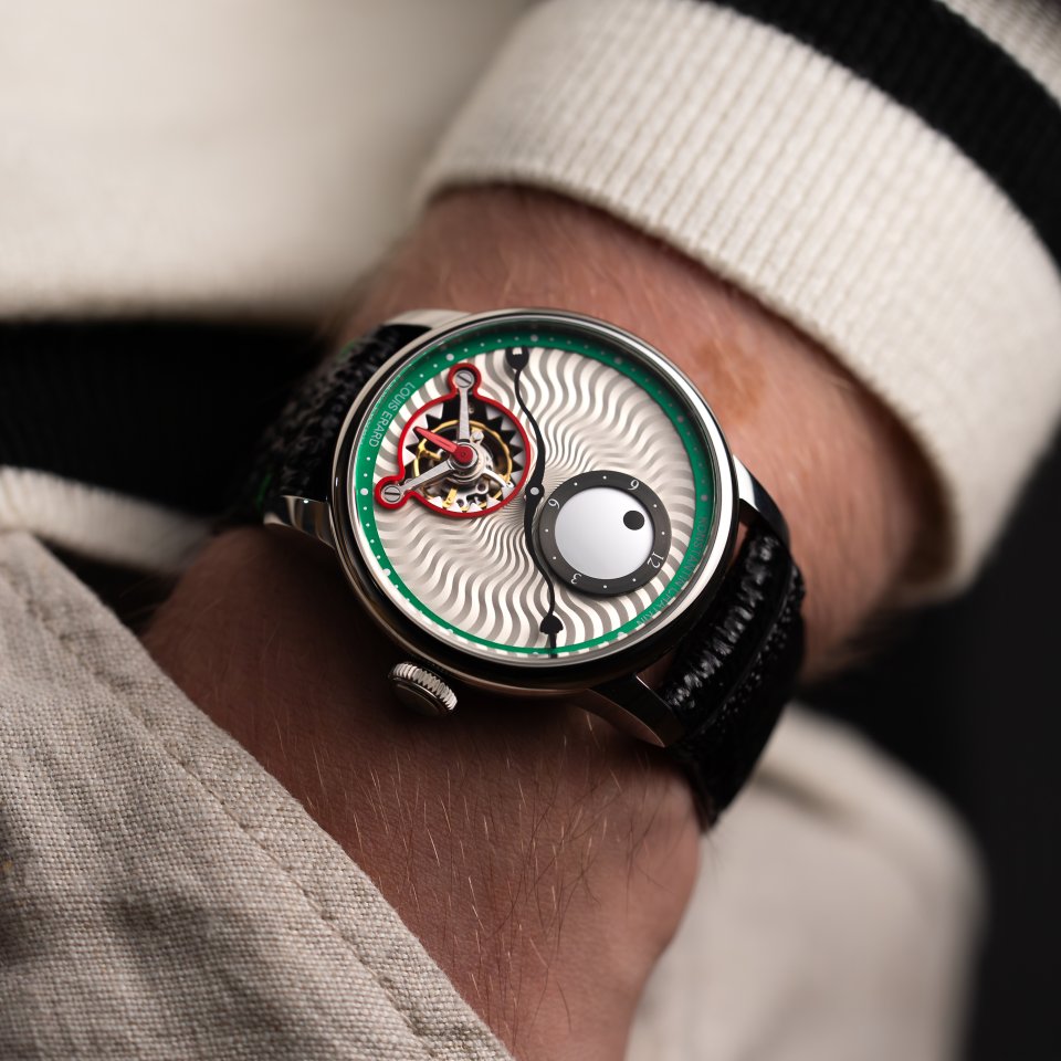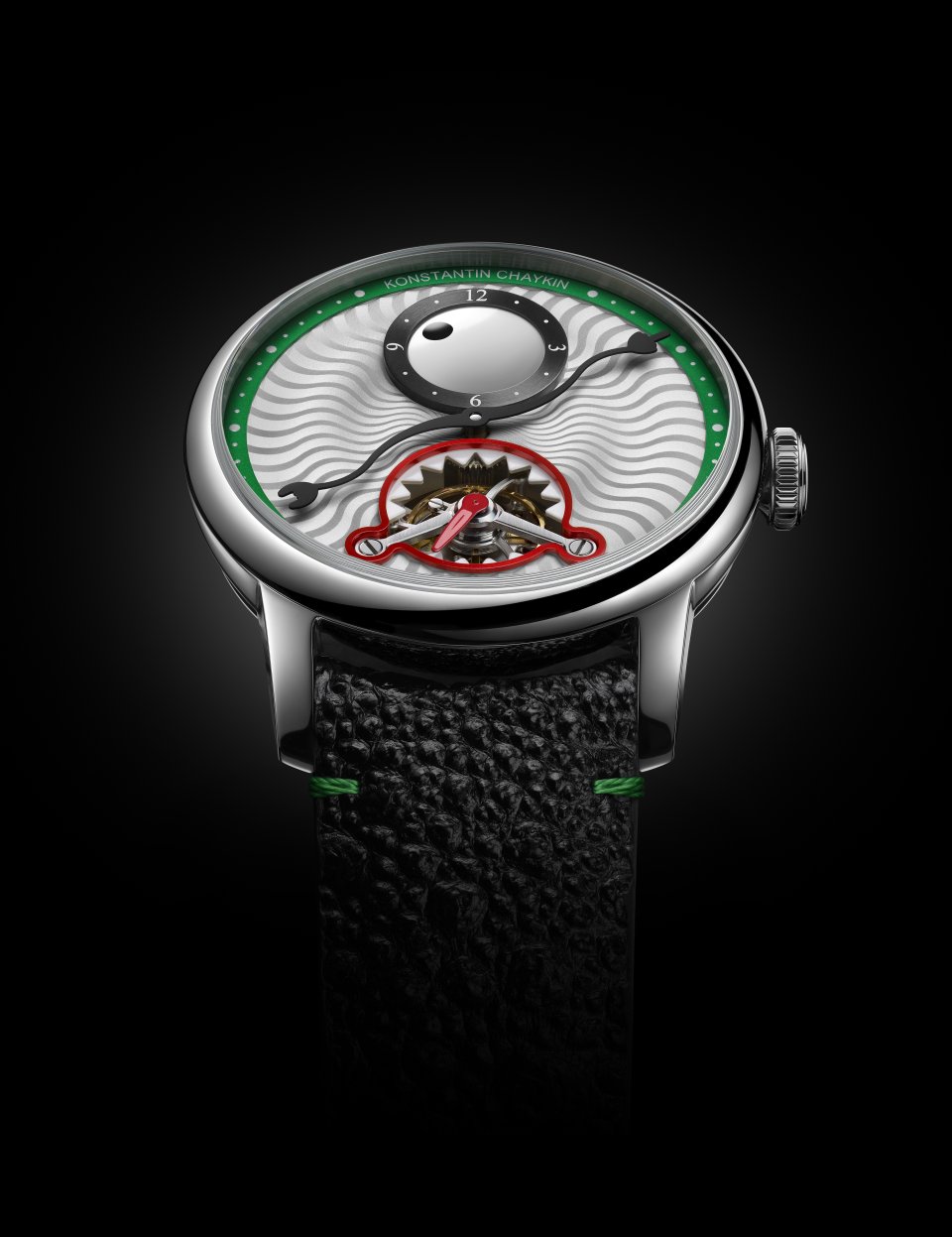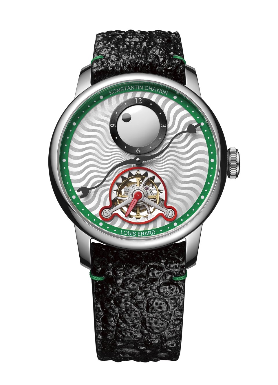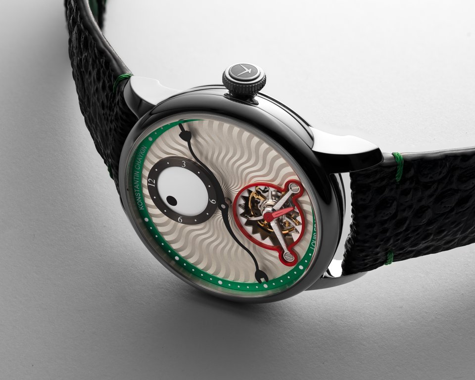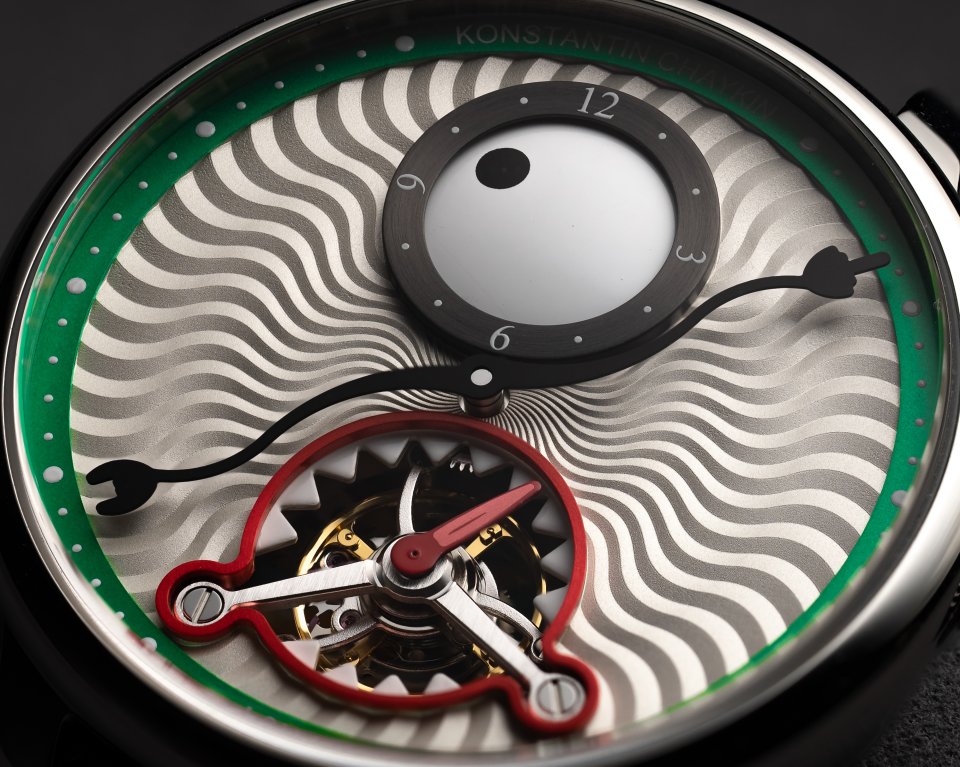 6時位置には鋭い歯をかたどったスピニングディスクの内側にトゥールビヨンケージが配置され、チャイキンお得意のモンスターらしさを表現しています。グリーンにカラーリングされた分表示リングには6時位置にルイ・エラールのロゴ、12時位置にコンスタンチン・チャイキンのネームが表記されています。