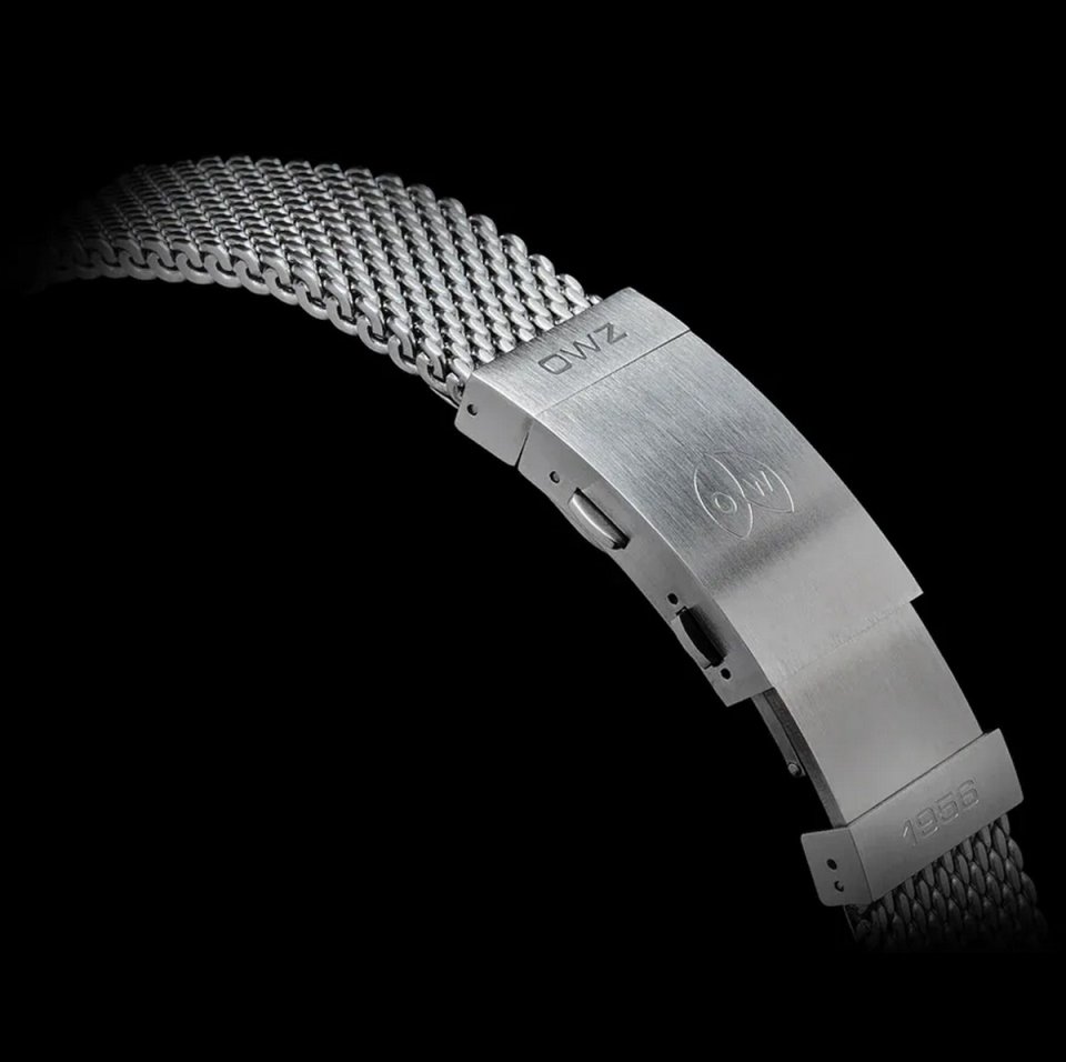 M-110のストラップは、ステンレススティール製メッシュブレスレットも選択可能です。M-Heritageステンレススティール製メッシュブレスレットは、ヘビーゲージの素材を両端補強して手磨き仕上げされ、O & W刻印入りクラスプはサイズ調整可能な機能を備えています。
