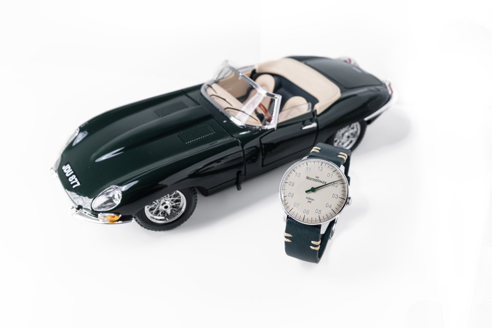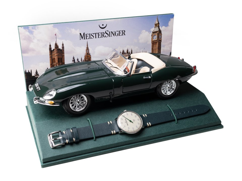 MeisterSinger『Edition Neo J.E』は限定100本。60年代を象徴する英国伝統のレーシンググリーンを纏った、Eタイプ・ジャガーのミニチュアモデル付き特別パッケージで登場します。