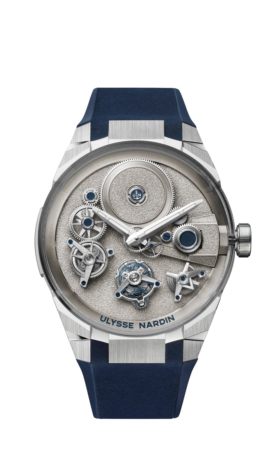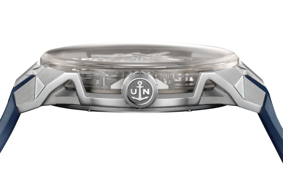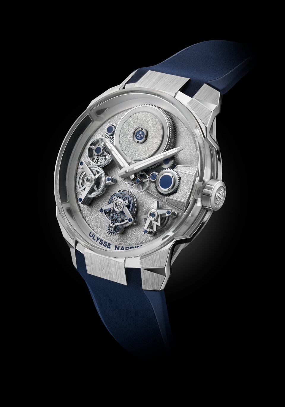 このエッジの効いたオート・オルロジュリーの複雑機構中心部には、ユニークで革新的なキャリバーUN-176が、まるで物理法則だけでなく、時計製造の原理そのものをも覆すかのように君臨しています。統合型マニュファクチュールによって完全設計されたこのフライング・ムーブメントの完成は、ユリス・ナルダンの技術部門が2年という時をかけて研究開発した集大成です。