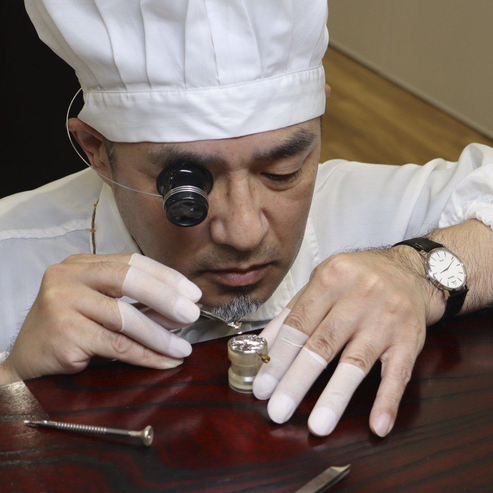 ムーブメントの受には、外側に向かって力強さを増す羽を緻密に彫金しています。これはクレドールの彫金工房が手掛けており、様々な工具を使い分けることによって、わずか0.15㎜の深さで彫りながら、深みのある美しさを生み出しています。