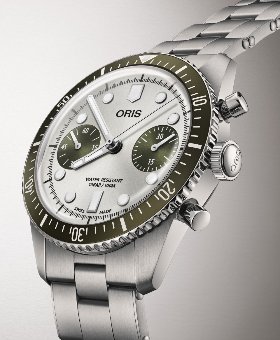 ポンプ式プッシャーや12時位置の盾型インデックスはネオ・ヴィンテージデザインを採用。サンレイ仕上げのシルバーグレーの文字盤にオークグリーンの積算計がアクセントとなったは配色は、Orisの本社ヘルシュタイン工場を囲む豊かな自然囲まれた丘陵地帯のから着想を得ました。1960年代の古き良きデザインを受け継ぎ、ディテールにこだわったベゼルは洗練されたスタイルを実現します。