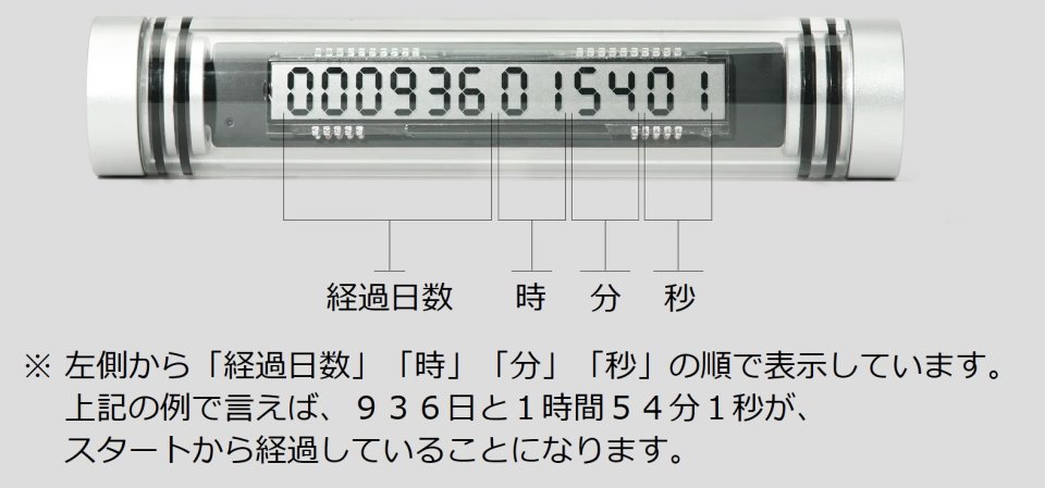 引き金を引き抜いた瞬間をチップのシリコンに焼き付け、カウントを始めます。ディスプレイには、最大999,999日、23時間59分59秒までの経過時間が表示されます。